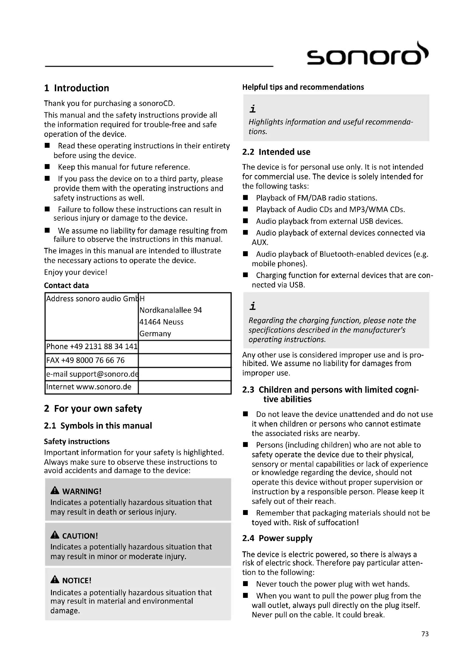 In case of a complaint, please contact our customer service department. You can find contact details ( ✉ 'Contact data' on page 73) or at www.sonoro.de.