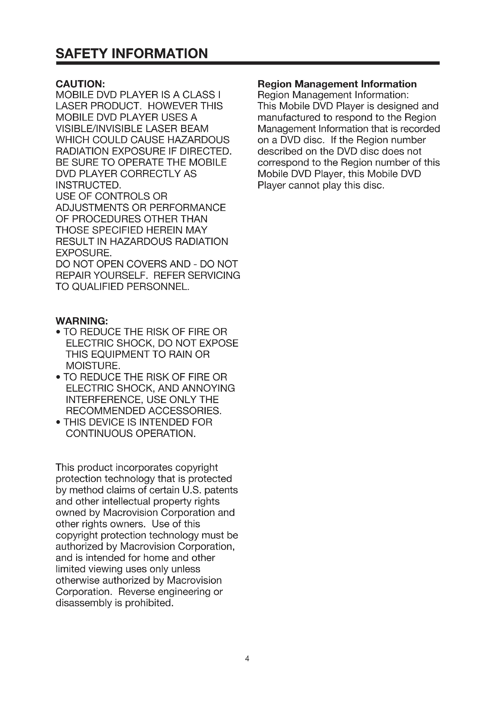 Region Management Information: This Mobile DVD Player is designed and manufactured to respond to the Region Management Information that is recorded on a DVD disc. If the Region number described on the DVD disc does not correspond to the Region number of this Mobile DVD Player, this Mobile DVD Player cannot play this disc.