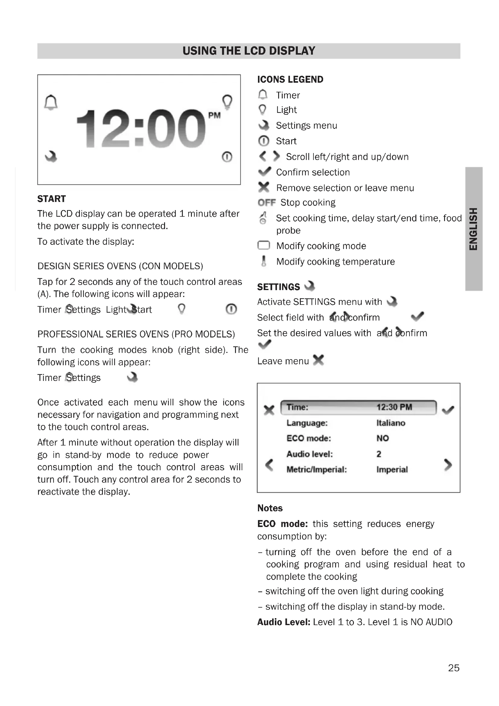 After 1 minute without operation the display will go in stand-by mode to reduce power consumption and the touch control areas will turn off. Touch any control area for 2 seconds to reactivate the display.