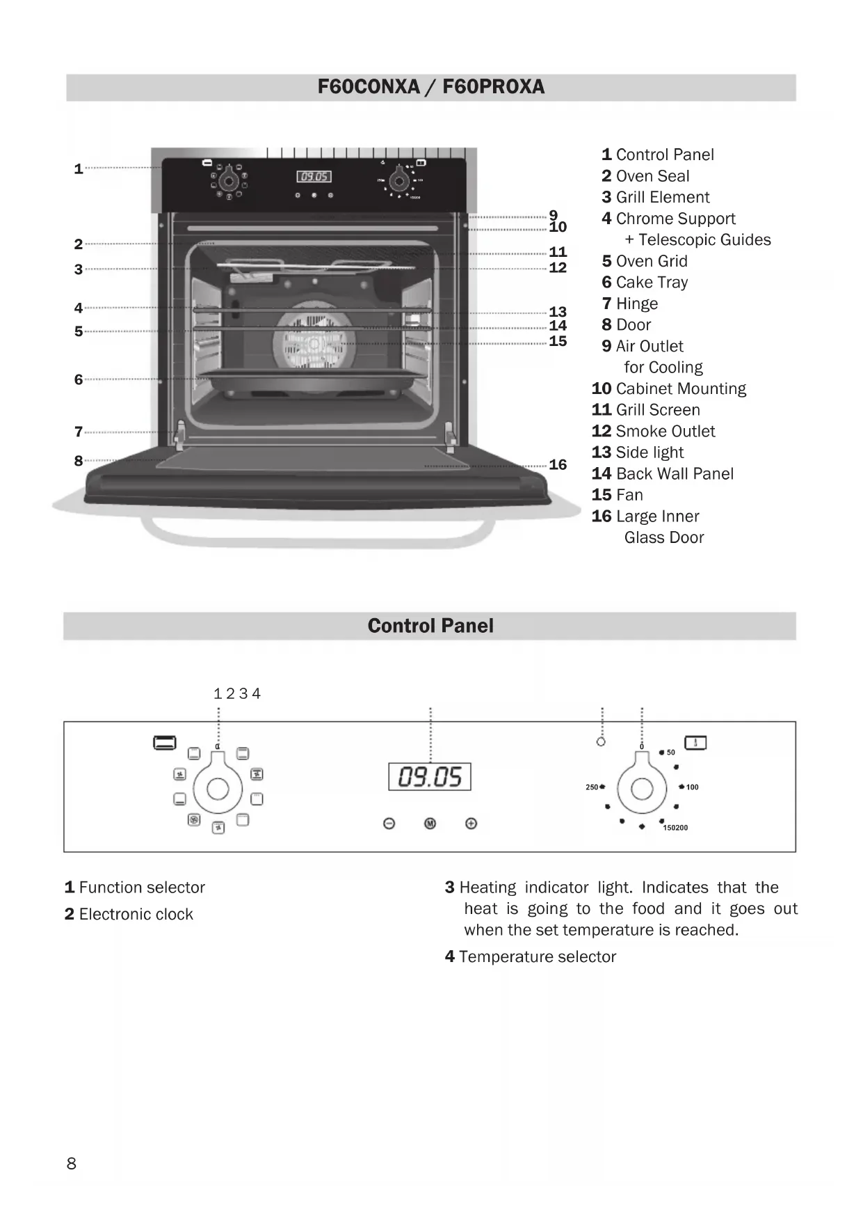 Control Panel 11 Control Panel 12 Oven Seal 13 Grill Element 14 Chrome Support + Telescopic Guides 15 Oven Grid 16 Cake Tray 17 Hinge 18 Door 19 Air Outlet for Cooling 10 Cabinet Mounting 11 Grill Screen 12 Smoke Outlet 13 Side light 14 Back Wall Panel 15 Fan 16 Large Inner Glass Door 1 Function selector 2 Electronic clock 3 Heating indicator light. Indicates that the heat is going to the food and it goes out when the set temperature is reached. 4 Temperature selector