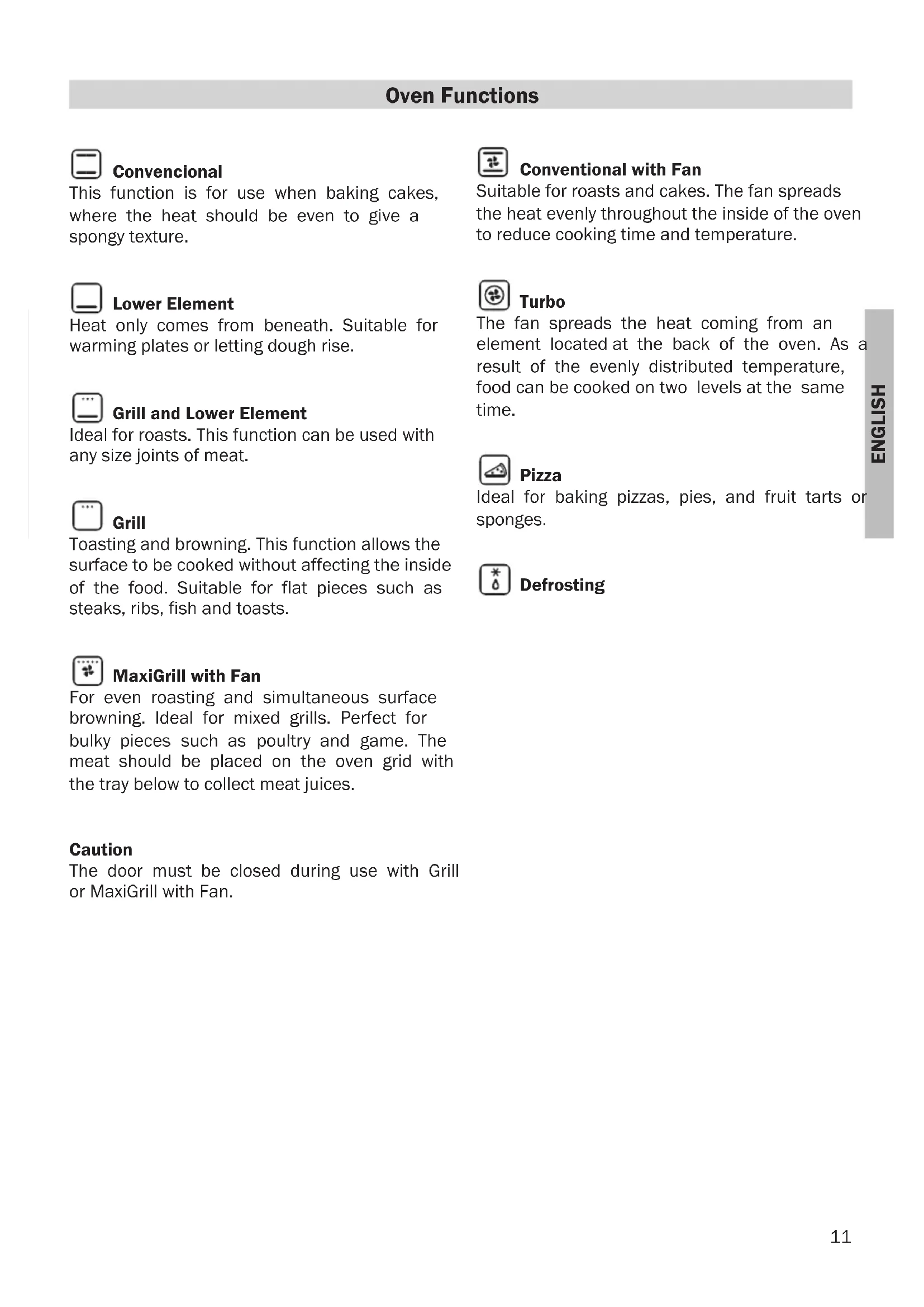ENGLISH Conventional with Fan Suitable for roasts and cakes. The fan spreads the heat evenly throughout the inside of the oven to reduce cooking time and temperature. Turbo The fan spreads the heat coming from an element located at the back of the oven. As a result of the evenly distributed temperature, food can be cooked on two levels at the same time. Pizza Ideal for baking pizzas, pies, and fruit tarts or sponges. Defrosting Convencional This function is for use when baking cakes, where the heat should be even to give a spongy texture. Lower Element Heat only comes from beneath. Suitable for warming plates or letting dough rise. Grill and Lower Element Ideal for roasts. This function can be used with any size joints of meat. Grill Toasting and browning. This function allows the surface to be cooked without affecting the inside of the food. Suitable for flat pieces such as steaks, ribs, fish and toasts. MaxiGrill with Fan For even roasting and simultaneous surface browning. Ideal for mixed grills. Perfect for bulky pieces such as poultry and game. The meat should be placed on the oven grid with the tray below to collect meat juices. Caution The door must be closed during use with Grill or MaxiGrill with Fan. Oven Functions12 Recommendations for Defrosting Food The defrost function works by means of a 2-level system of hot air. HI is for meats in general and LO is for fish, cakes, pastries and bread. When selecting the defrost function, select HI or LO on the temperature display by pressing on the temperature sensor and then the or sensors.