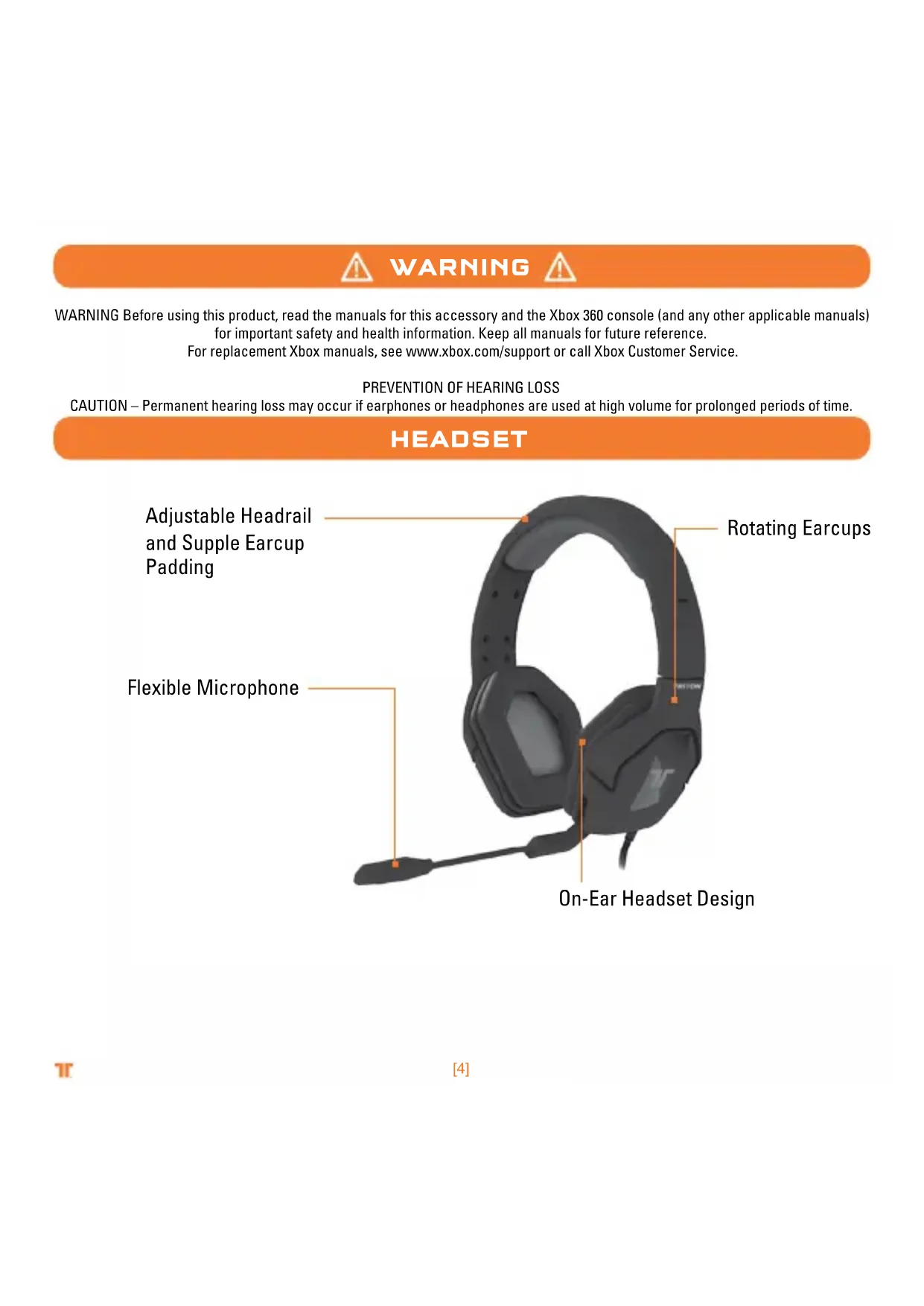27[4] Adjustable Headrail and Supple Earcup Padding Flexible Microphone On-Ear Headset Design WarnIng HeaDset WARNING Before using this product, read the manuals for this accessory and the Xbox 360 console (and any other applicable manuals) for important safety and health information. Keep all manuals for future reference. For replacement Xbox manuals, see www.xbox.com/support or call Xbox Customer Service.