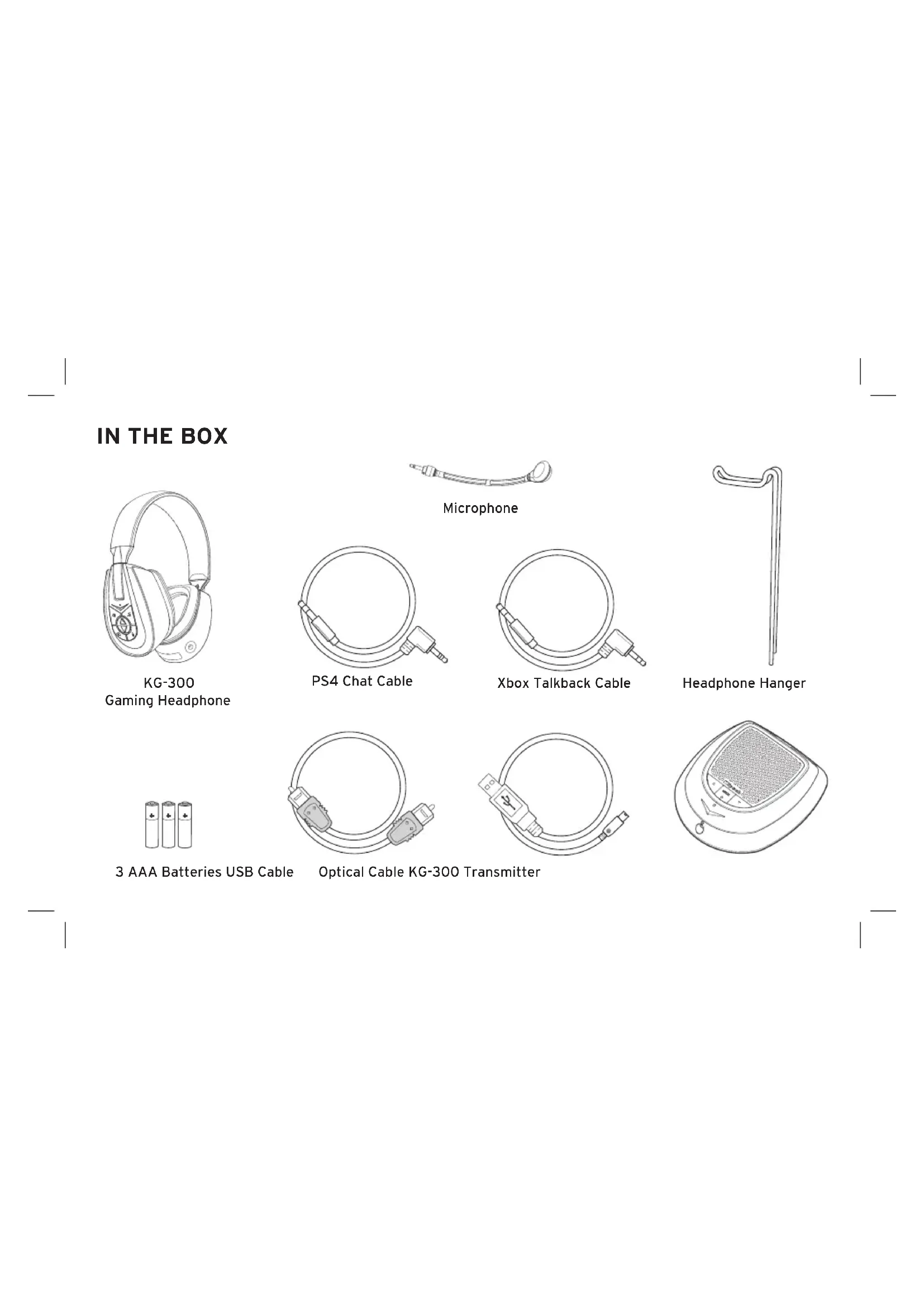 KG-300 Gaming Headphone Microphone 3 AAA Batteries USB Cable Xbox Talkback Cable Optical Cable KG-300 Transmitter Headphone Hanger PS4 Chat CablePREPARE HEADSET AND TRANSMITTER USE Place the 3 AAA batteries in the left ear cup battery compartment