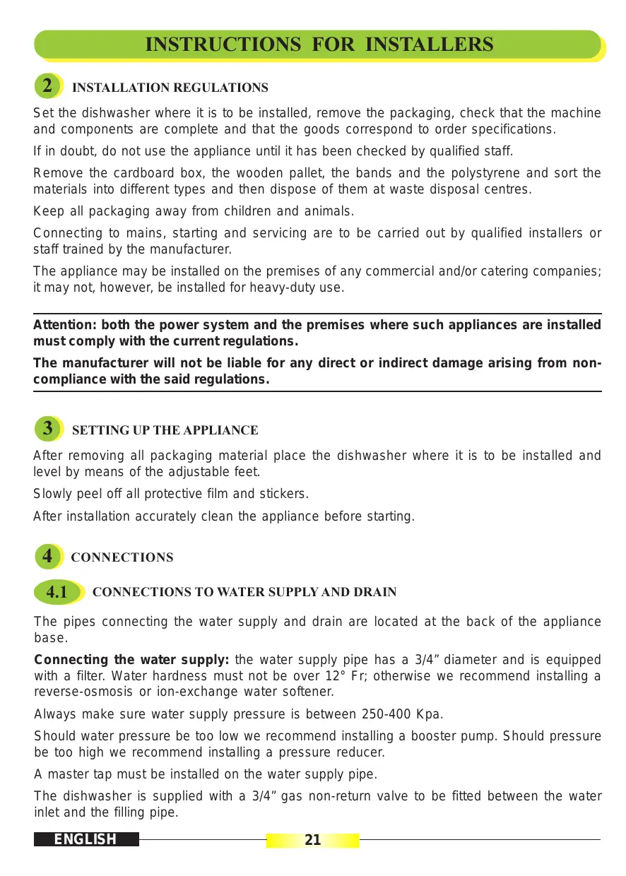 Connecting the water supply: the water supply pipe has a 3/4” diameter and is equipped with a filter. Water hardness must not be over 12° Fr; otherwise we recommend installing a reverse-osmosis or ion-exchange water softener. Always make sure water supply pressure is between 250-400 Kpa. Should water pressure be too low we recommend installing a booster pump. Should pressure be too high we recommend installing a pressure reducer. A master tap must be installed on the water supply pipe. The dishwasher is supplied with a 3/4” gas non-return valve to be fitted between the water inlet and the filling pipe.