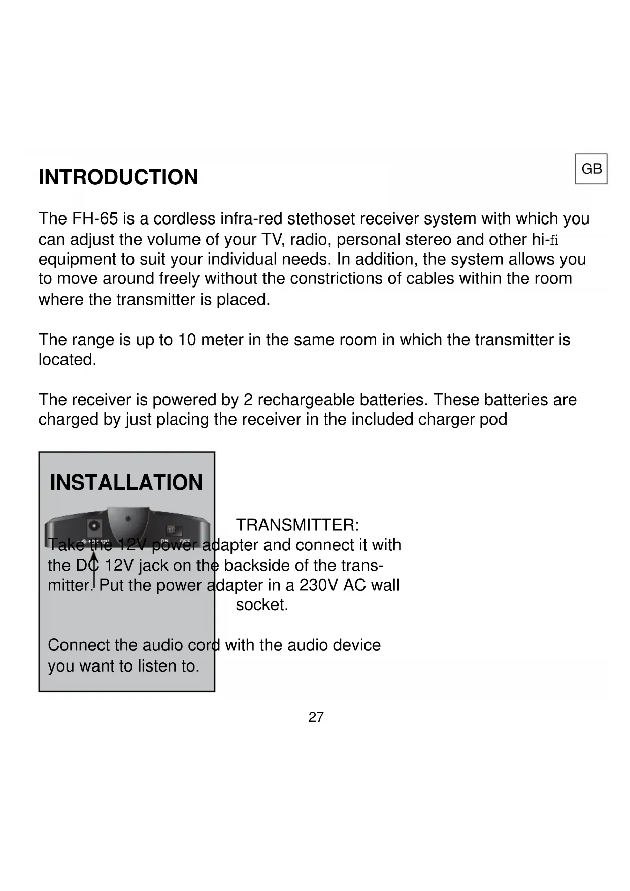 The FH-65 is a cordless infra-red stethoset receiver system with which you can adjust the volume of your TV, radio, personal stereo and other hi-fi equipment to suit your individual needs. In addition, the system allows you to move around freely without the constrictions of cables within the room where the transmitter is placed.