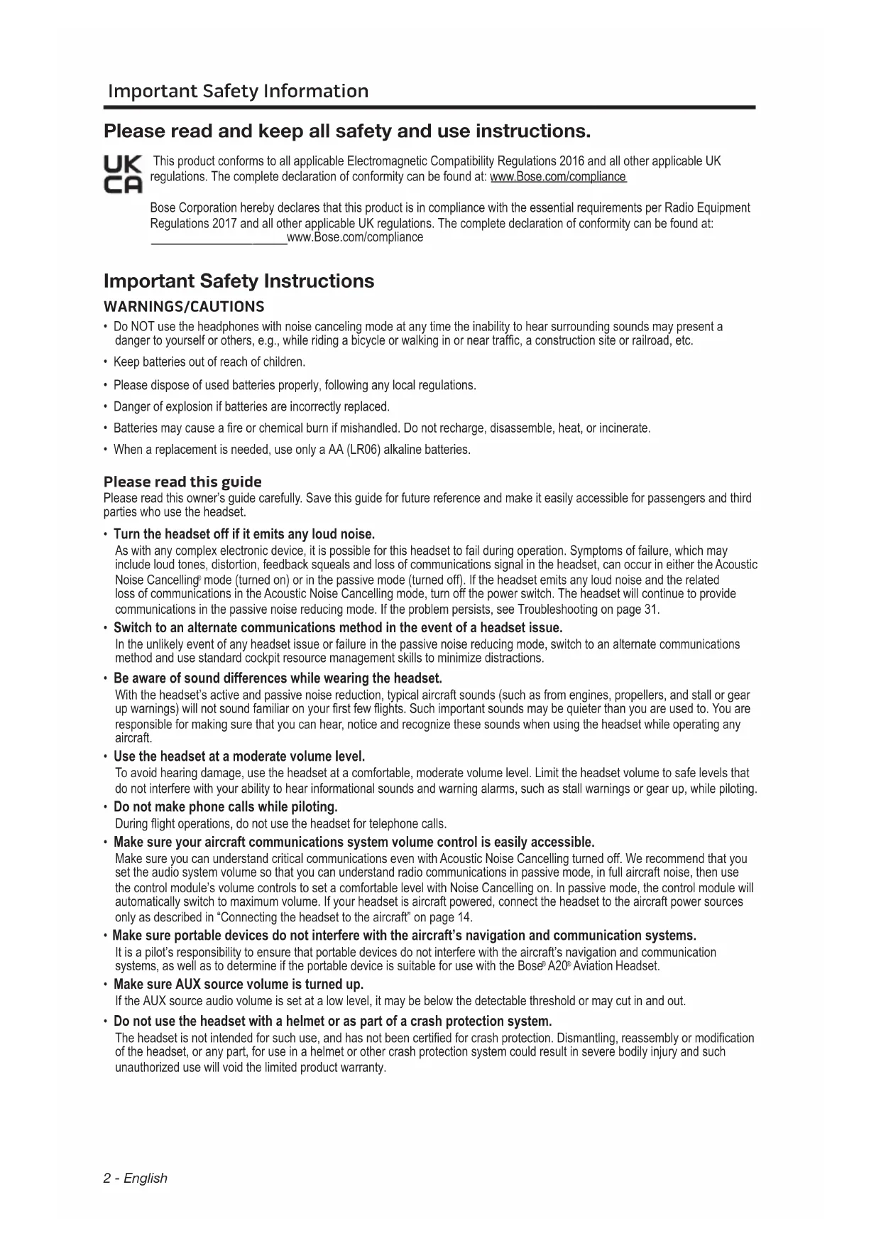 Please read and keep all safety and use instructions. This product conforms to all applicable Electromagnetic Compatibility Regulations 2016 and all other applicable UK regulations. The complete declaration of conformity can be found at: www.Bose.com/compliancewww.Bose.com/compliance Bose Corporation hereby declares that this product is in compliance with the essential requirements per Radio Equipment Regulations 2017 and all other applicable UK regulations. The complete declaration of conformity can be found at: www.Bose.com/compliancewww.Bose.com/compliance Important Safety Instructions WARNINGS/CAUTIONS