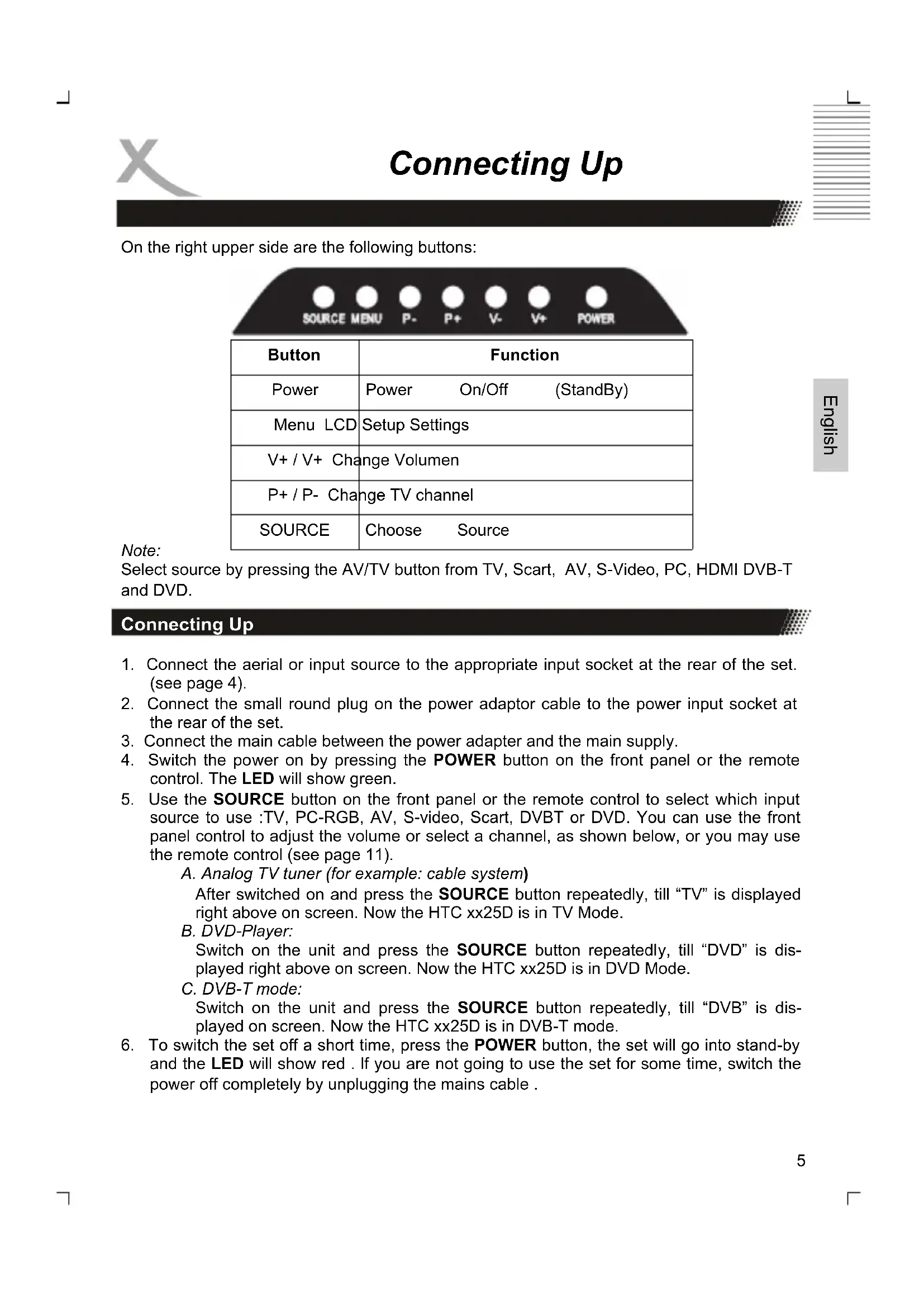and the LED will show red . lf you are not going to use the set for some time, switch the power off completely by unplugging the mains cable . Connecting Up Connecting Up6 English Connection Power connection Connect the AC/DC power adapter with the DC IN input of the HTC TV set. After than, please connect the power cable with the wall mounted power outlet. On the front side you can see a red LED light. The HTC TV set is now in Stand-By mode. By pressing the POWER button on the remote control or on the top side of the device the red LED changes to a green light. Antenna The HTC TV set has an analogue and a digital TV Tuner inside. For receiving analogue TV signals please connect the antenna cable with the RF connector on the HTC TV set and with the VHF/UHF roof antenna or with a CATV antenna plug. For receiving digital terrestical TV signals please connect the HTC TV set with the RF plug and also with the roof antenna. If no roof antenna is available, please use indoor aerial. For activating the analogue TV Tuner, please switch with the Source button to „TV“. For viewing DVB-T, please change with the SOURCE button to „DVB“. Note: For getting the best DVB-T reception please uses the roof antenna. If not possible, than you can connect the HTC TV set with an active indoor aerial. SCART Input Audio– and Video signals from a VCR or a setop box can be transmitted by SCART. Please connect a SCART cable with the SCART input on the HTC TV set and with the SCART output on the VCR or setop box. Press the SOURCE button again until „SCART“ appears on the screen and the SCART interface is activated. CVBS Video– and Stereo Audio input If you uses more than one multimedia terminals and the SCART, HDMI and S-Video connection are used, than you connect the next device by the audio/video component input. Please connect the yellow wire of an 3-pin component cable with the VIDEO input of the HTC TV set and the multimedia device. With this kind of connection only video signals are transmitted. For listening sound on the TV you should establish also a sound connection. Please connect the white and red wire of the 3-pin component cable with the AUDIO IN L / R and the correspondent audio out on the multimedia device.7 English Connection Please press the SOURCE button until „AV“ appears on the screen and the AV input is ac- tive. S-Video Video- und Stereo Audio input If you uses more than one multimedia terminals and the SCART, HDMI and AV connection are used, than you connect the next device by the S-Video. Please connect the S-Video cable with the S-VIDEO input of the HTC TV set and with the S-Video output of the multime- dia device. With this kind of connection only video signals are transmitted. For listening sound on the TV you should establish also a sound connection. Please connect the white and red wire of the 2-pin cable with the AUDIO IN L / R and the correspondent audio out on the multimedia device. Please press the SOURCE button until „S-Video“ appears on the screen and the S-Video input is active. HDMI If you want connect a multimedia device with HDMI like a game console „PS3“ or a setop box with the HTC TV set, you can establish a HDMI connection. Please con- nect the HDMI cable on the HDMI interface on the HTC TV set and the HDMI output of the multimedia device. Please press the SOURCE button until „HDMI“ appears on the screen and the HDMI input is active.