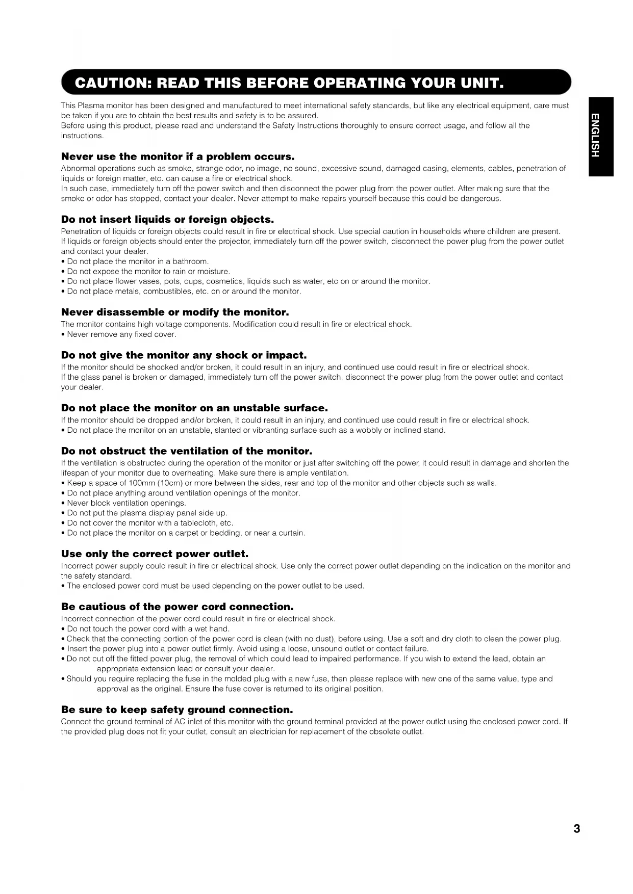 This Plasma monitor has been designed and manufactured to meet international safety standards, but like any electrical equipment, care must be taken if you are to obtain the best results and safety is to be assured.