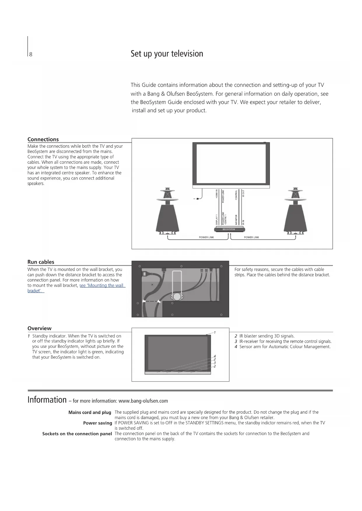 BeoVision 12Technical specications, features and the use thereof are subject to change without notice. Version 1.0 1111 Cautions, 4 English, 8 Dansk (Danish), 12 Deutsch (German), 16 Español (Spanish), 20 Français (French), 24 Italiano (Italian), 28 Nederlands (Dutch), 32 Português (Portuguese), 36 Suomi (Finnish), 40 Svenska (Swedish), 44 Ελληνικά (Greek), 48 Русский (Russian), 52 繁體中文 (Traditional Chinese), 56 简体中文 (Simplied Chinese), 60 한국어 (Korean), 64 日本語 (Japanese), 68 (Arabic), 72 Česky (Czech), 76 Magyar (Hungarian), 80 Latviski (Latvian), 84 Lietuvių k. (Lithuanian), 88 Polski (Polish), 92 Slovenčina (Slovakian), 96 Slovenščina (Slovenian), 100 Important information, 104English – Place your television on a rm, stable surface. – The TV is not designed to stand on its own. It must be supported until mounted on a wall bracket. To prevent injury, use Bang & Olufsen approved wall brackets only! – Ensure that the television is positioned, set up and connected in accordance with the instructions in this Guide. – Do not subject the television to rain, high humidity or sources of heat.