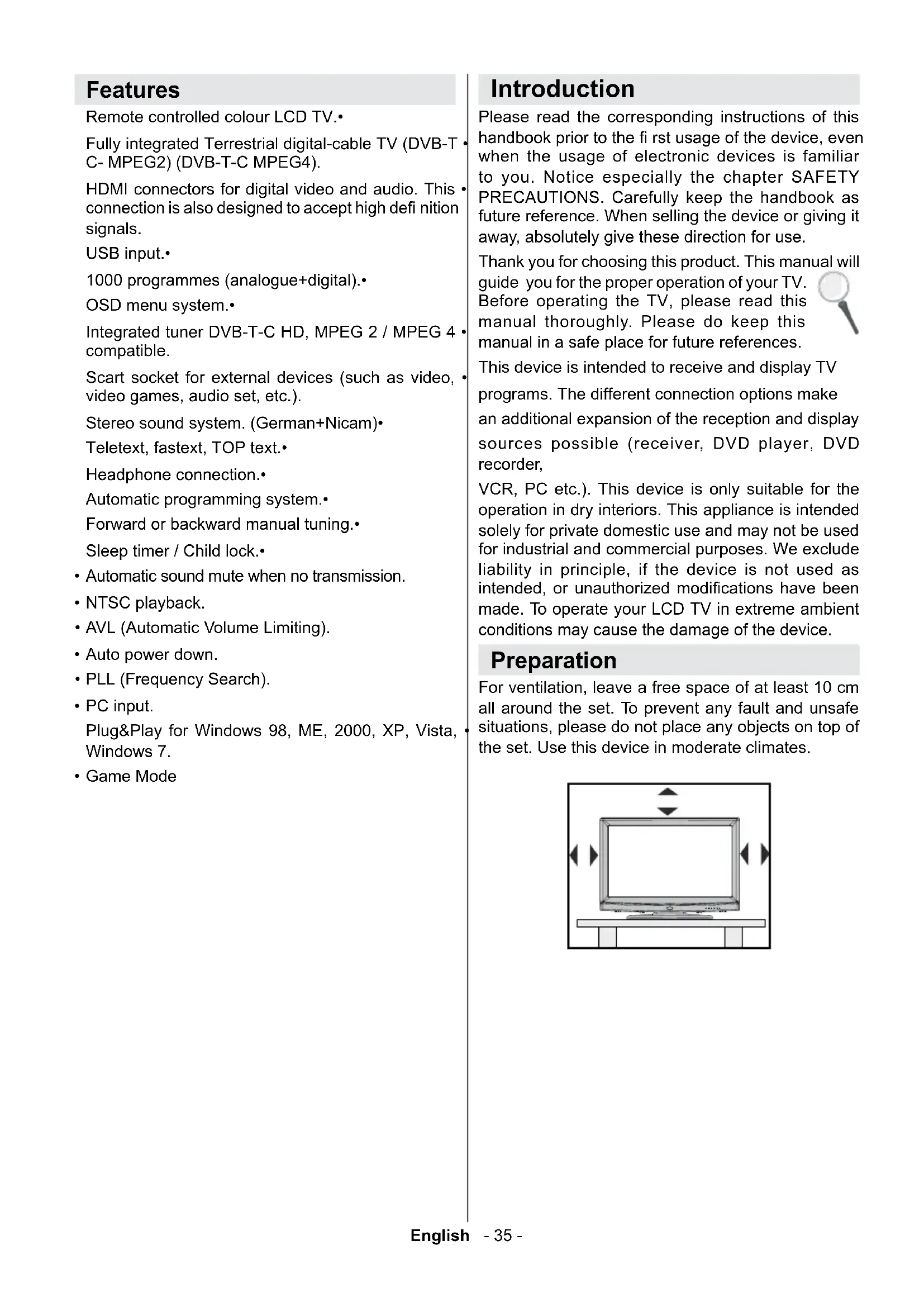 - Digital Reception (DVB-C) English - 35 - Features Remote controlled colour LCD TV.• Fully integrated Terrestrial digital-cable TV (DVB-T • C- MPEG2) (DVB-T-C MPEG4). HDMI connectors for digital video and audio. This • connection is also designed to accept high defi nition signals. USB input.• 1000 programmes (analogue+digital).• OSD menu system.• Integrated tuner DVB-T-C HD, MPEG 2 / MPEG 4 • compatible. Scart socket for external devices (such as video, • video games, audio set, etc.). Stereo sound system. (German+Nicam)• Teletext, fastext, TOP text.• Headphone connection.• Automatic programming system.• Forward or backward manual tuning.• Sleep timer / Child lock.• Automatic sound mute when no transmission.• NTSC playback. • AVL (Automatic Volume Limiting).• Auto power down.• PLL (Frequency Search).• PC input. • Plug&Play for Windows 98, ME, 2000, XP, Vista, • Windows 7. Game Mode • Introduction Please read the corresponding instructions of this handbook prior to the fi rst usage of the device, even when the usage of electronic devices is familiar to you. Notice especially the chapter SAFETY PRECAUTIONS. Carefully keep the handbook as future reference. When selling the device or giving it away, absolutely give these direction for use. Thank you for choosing this product. This manual will guide you for the proper operation of your TV. Before operating the TV, please read this manual thoroughly. Please do keep this manual in a safe place for future references. This device is intended to receive and display TV programs. The different connection options make an additional expansion of the reception and display sources possible (receiver, DVD player, DVD recorder, VCR, PC etc.). This device is only suitable for the operation in dry interiors. This appliance is intended solely for private domestic use and may not be used for industrial and commercial purposes. We exclude liability in principle, if the device is not used as intended, or unauthorized modifi cations have been made. To operate your LCD TV in extreme ambient conditions may cause the damage of the device. Preparation For ventilation, leave a free space of at least 10 cm all around the set. To prevent any fault and unsafe situations, please do not place any objects on top of the set. Use this device in moderate climates. 10 cm 10 cm 10 cmEnglish - 36 - Safety Precautions Read the following recommended safety precautions carefully for your safety. Power Source The TV set should be operated only from a 220-240 V AC, 50 Hz outlet. Ensure that you select the correct voltage setting for your convenience. Power Cord Do not place the set, a piece of furniture, etc. on the power cord (mains lead) or pinch the cord. Handle the power cord by the plug. Do not unplug the appliance by pulling from the power cord and never touch the power cord with wet hands as this could cause a short circuit or electric shock. Never make a knot in the cord or tie it with other cords. The power cords should be placed in such a way that they are not likely to be stepped on. A damaged power cord can cause fi re or give you an electric shock. When it is damaged and needs to be replaced, it should be done by qualifi ed personnel. Moisture and Water Do not use this device in a humid and damp place (avoid the bathroom, the sink in the kitchen, and near the washing machine). Do not expose this device to rain or water, as this may be dangerous and do not place objects filled with liquids, such as fl ower vases, on top. Avoid from dripping or splashing. If any solid object or liquid falls into the cabinet, unplug the TV and have it checked by qualifi ed personnel before operating it any further. Cleaning Before cleaning, unplug the TV set from the wall outlet. Do not use liquid or aerosol cleaners. Use soft and dry cloth. Ventilation The slots and openings on the TV set are intended for ventilation and to ensure reliable operation. To prevent overheating, these openings must not be blocked or covered in anyway. Heat and Flames The set should not be placed near to open fl ames and sources of intense heat such as an electric heater. Ensure that no open fl ame sources, such as lighted candles, are placed on top of the TV. Batteries should not be exposed to excessive heat such as sunshine, fi re or the like. Lightning In case of storm and lightning or when going on holiday, disconnect the power cord from the wall outlet. Replacement Parts When replacement parts are required, make sure that the service technician has used replacement parts, which are specifi ed by the manufacturer or have the same specifi cations as the original one. Unauthorized substitutions may result in fi re, electrical shock or other hazards. Servicing Please refer all servicing to qualifi ed personnel. Do not remove the cover yourself as this may result in an electric shock. Waste Disposal Instructions for waste disposal:• Packaging and packaging aids are recyclable and should principally be recycled. Packaging materials, such as foil bag, must be kept away from children. Batteries, including those which are heavy metal-free, should not be disposed of with household waste. Please dispose of used battery in an environment friendly manner. Find out about the legal regulations which apply in your area. p. 63