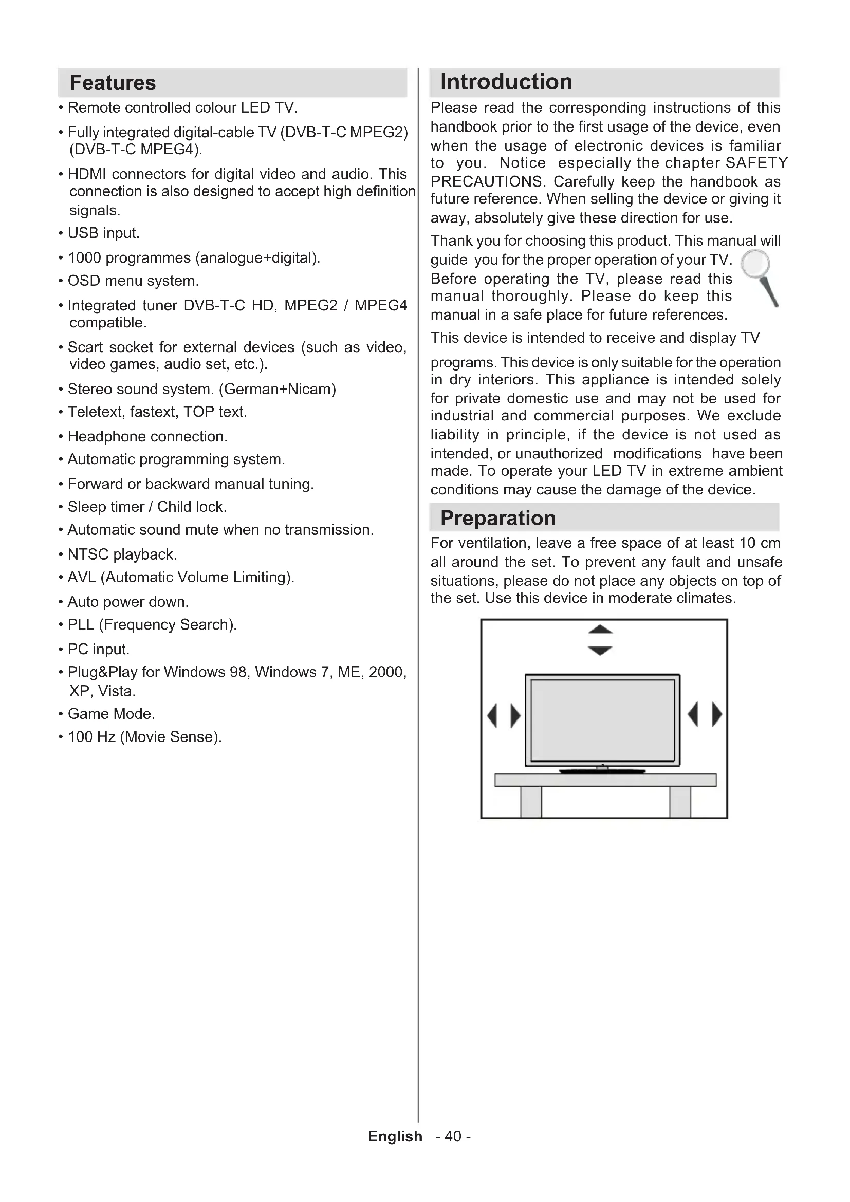 PRECAUTIONS. Carefully keep the handbook as future reference. When selling the device or giving it away, absolutely give these direction for use. Thank you for choosing this product. This manual will guide you for the proper operation of your TV. Before operating the TV, please read this manual thoroughly. Please do keep this manual in a safe place for future references. This device is intended to receive and display TV programs. This device is only suitable for the operation in dry interiors. This appliance is intended solely for private domestic use and may not be used for industrial and commercial purposes. We exclude liability in principle, if the device is not used as