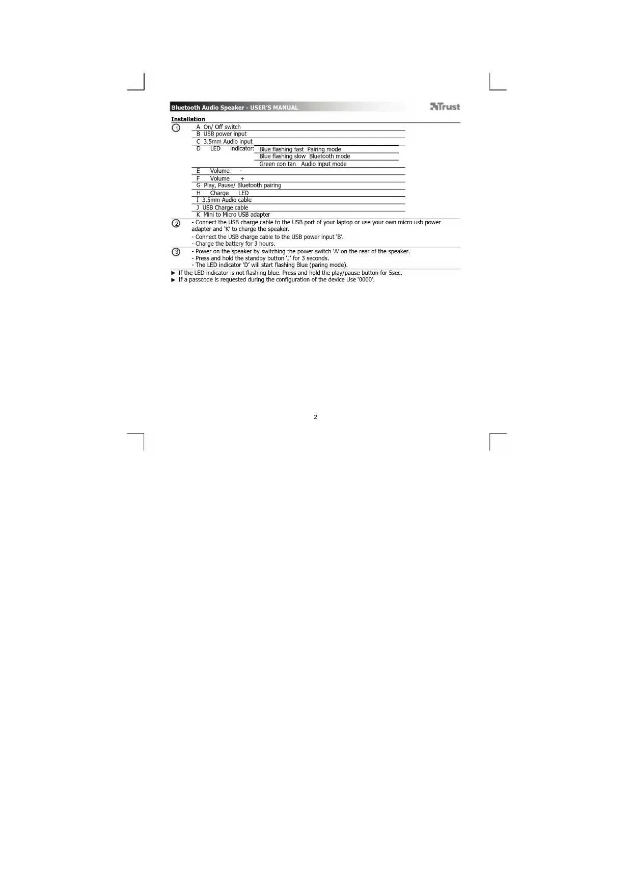- Connect the USB charge cable to the USB port of your laptop or use your own micro usb power adapter and ‘K’ to charge the speaker. - Connect the USB charge cable to the USB power input ‘B’. - Charge the battery for 3 hours. - Power on the speaker by switching the power switch ‘A’ on the rear of the speaker. - Press and hold the standby button ‘J’ for 3 seconds. - The LED indicator ‘D’ will start flashing Blue (paring mode). If the LED indicator is not flashing blue. Press and hold the play/pause button for 5sec. If a passcode is requested during the configuration of the device Use ‘0000’.