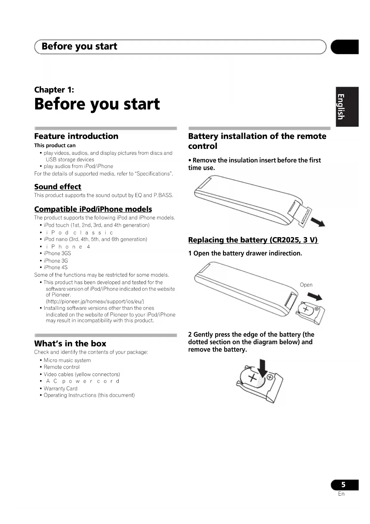 Before you start Feature introduction This product can• play videos, audios, and display pictures from discs and USB storage devices• play audios from iPod/iPhoneFor the details of supported media, refer to “Specifications”. Sound effect This product supports the sound output by EQ and P.BASS. Compatible iPod/iPhone models The product supports the following iPod and iPhone models.• iPod touch (1st, 2nd, 3rd, and 4th generation)•iPod classic• iPod nano (3rd, 4th, 5th, and 6th generation)•iPhone 4• iPhone 3GS• iPhone 3G• iPhone 4SSome of the functions may be restricted for some models. • This product has been developed and tested for the software version of iPod/iPhone indicated on the website of Pioneer.(http://pioneer.jp/homeav/support/ios/eu/)• Installing software versions other than the ones indicated on the website of Pioneer to your iPod/iPhone may result in incompatibility with this product. What’s in the box Check and identify the contents of your package:• Micro music system• Remote control• Video cables (yellow connectors)•AC power cord• Warranty Card• Operating Instructions (this document) Battery installation of the remote control