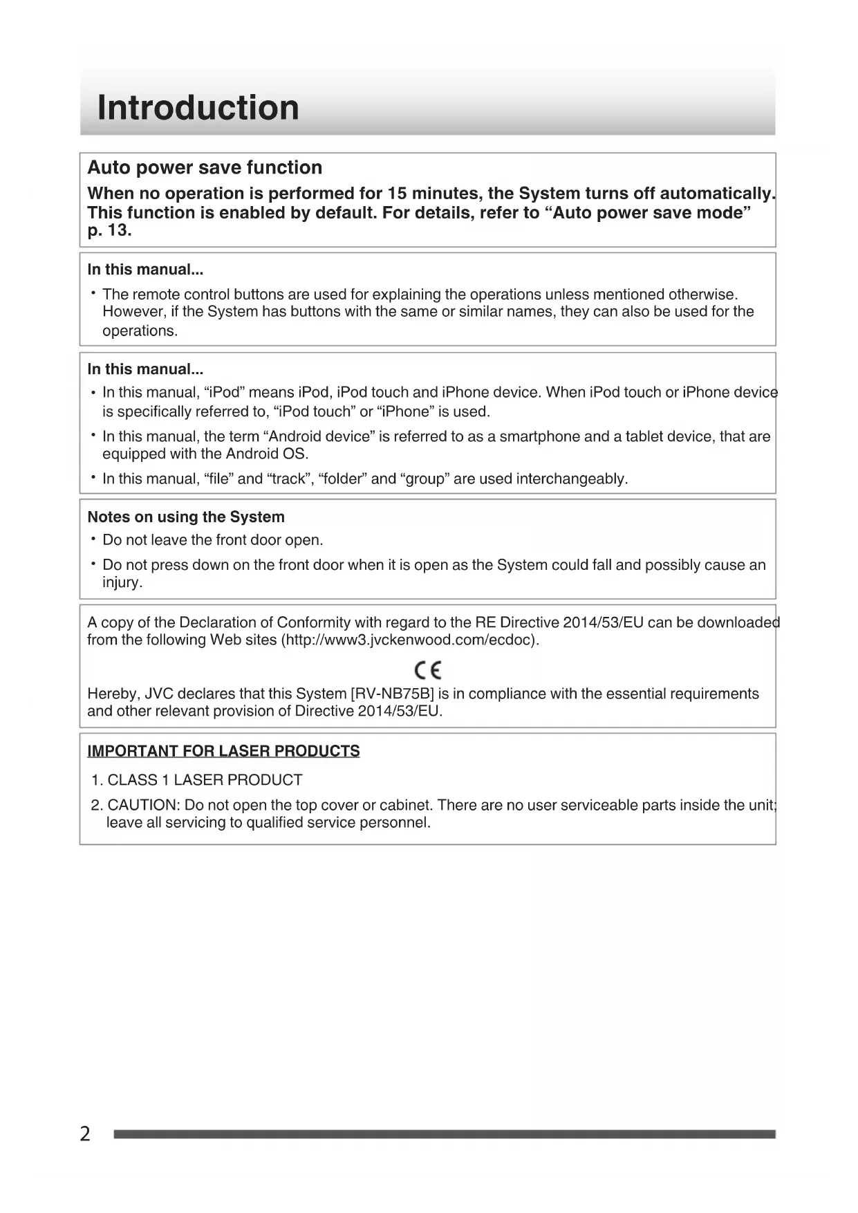 Do not press down on the front door when it is open as the System could fall and possibly cause an injury. A copy of the Declaration of Conformity with regard to the RE Directive 2014/53/EU can be downloaded from the following Web sites (http://www3.jvckenwood.com/ecdoc). Hereby, JVC declares that this System [RV-NB75B] is in compliance with the essential requirements and other relevant provision of Directive 2014/53/EU.