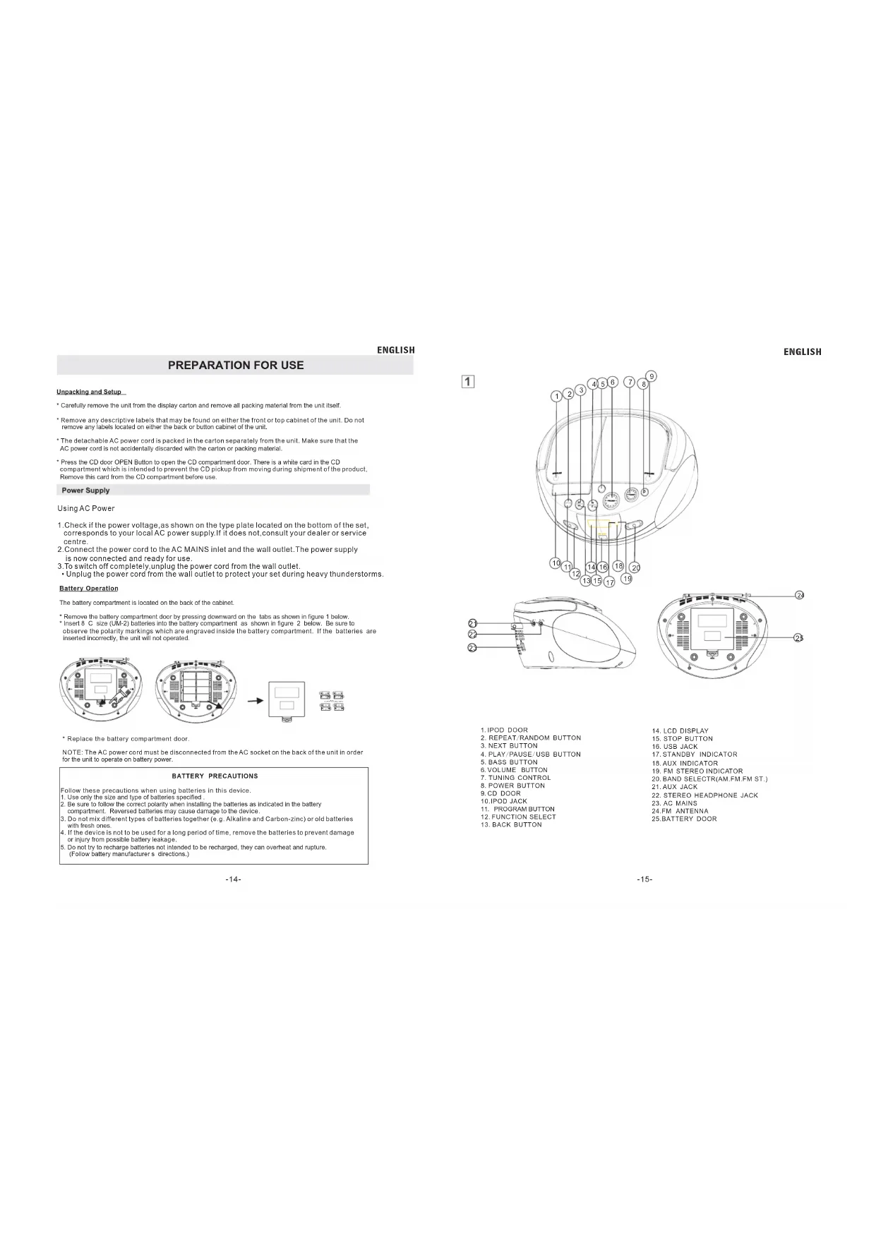 - repeat a track/CD/program - play CD tracks in random order 3.SEARCH NEXT ( ) -MP3/CD: - Skip or search a passage /track forwards. 4.PLAY/PAUSE /USB BUTTON ( ) - start or pause MP3/CD play - Press and Hold more than 1.5 sec change CD/USB media. 5.BASS BUTTON 6.VOLUME - adjust volume level 7.TUNING CONTROL - select AM/FM/FM ST. Stations. 8.POWER BUTTON -Press POWER button to turn on/off power. 9.CD DOOR -Lift the CD lid to open/close the CD door. 10.IPOD JACK( (The special of ipod connects ) -Push fuction button select AUX station, play IPOD and supply power. -After connecting audio equipment to the AUX INPUT JACK,the IPOD will have no funciton . -The unit does not control the ipod 11.PROGRAM -program and review programmed track numbers. 12.FUNCTION SELECT - select source of sound MP3/CD, AUX or RADIO. 13.SEARCH BACK ( ) -MP3/CD: - Skip or search a passage /track backwards. OPEN BUTTON ENGLISH VOLUME.
