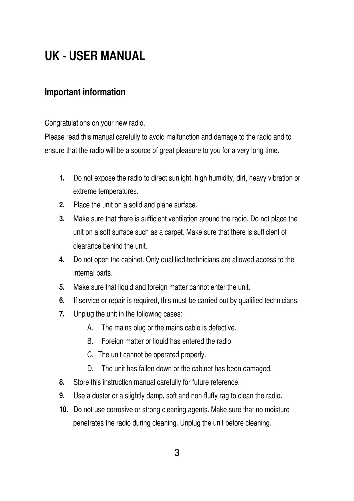 Important information Congratulations on your new radio. Please read this manual carefully to avoid malfunction and damage to the radio and to ensure that the radio will be a source of great pleasure to you for a very long time.