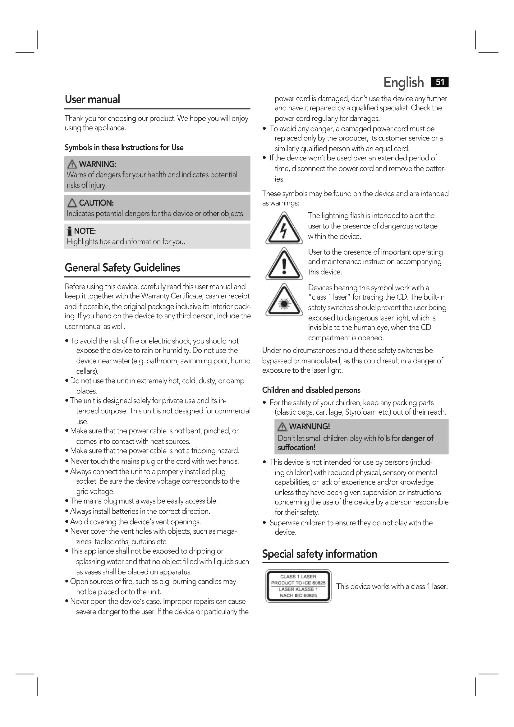 If the device won’t be used over an extended period of time, disconnect the power cord and remove the batter- ies. These symbols may be found on the device and are intended as warnings: The lightning flash is intended to alert the user to the presence of dangerous voltage within the device. User to the presence of important operating and maintenance instruction accompanying this device. Devices bearing this symbol work with a “class 1 laser” for tracing the CD. The built-in safety switches should prevent the user being exposed to dangerous laser light, which is invisible to the human eye, when the CD compartment is opened. Under no circumstances should these safety switches be bypassed or manipulated, as this could result in a danger of exposure to the laser light. Children and disabled persons