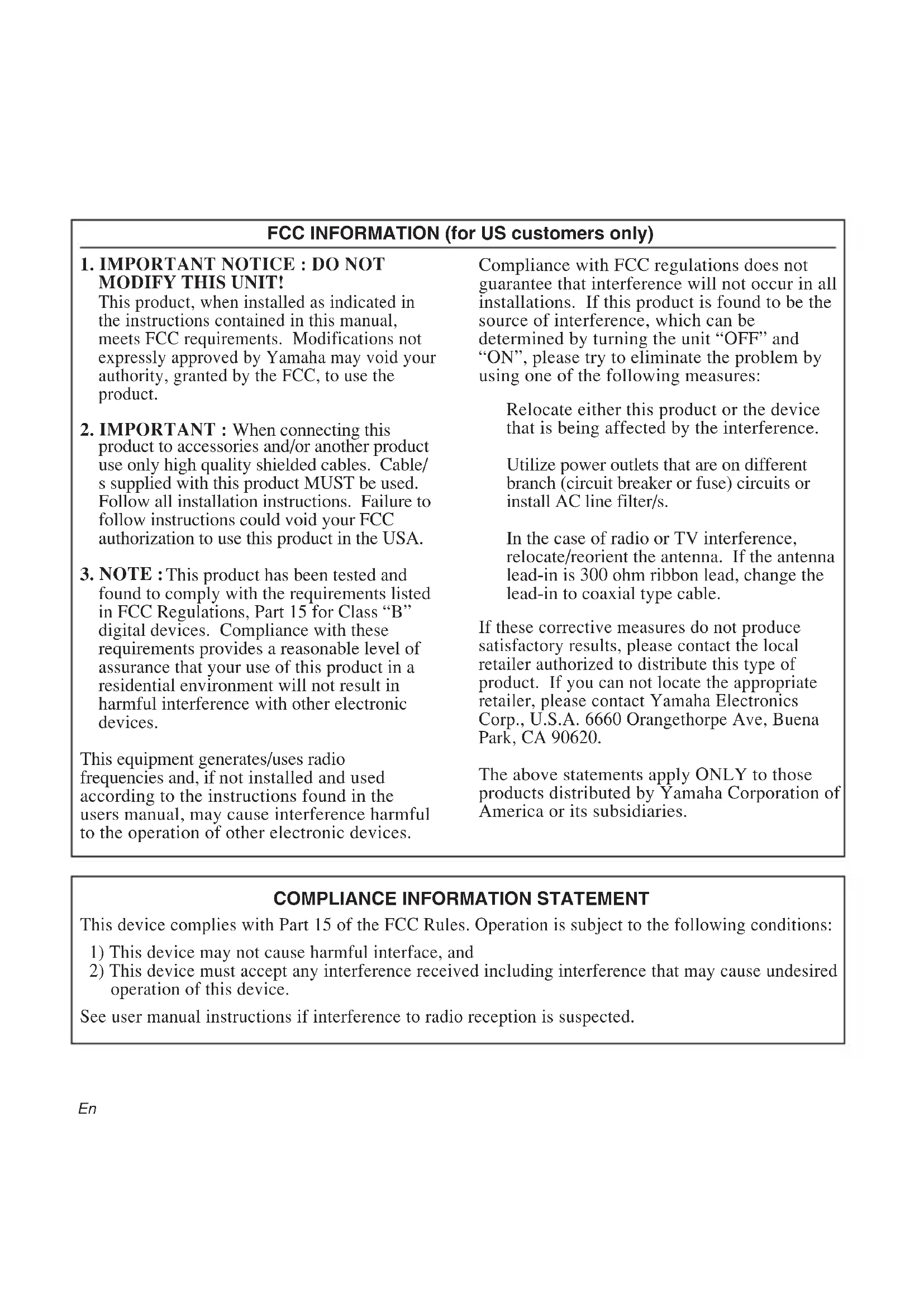 operation of this device. See user manual instructions if interference to radio reception is suspected. Compliance with FCC regulations does not guarantee that interference will not occur in all installations. If this product is found to be the source of interference, which can be determined by turning the unit “OFF” and “ON”, please try to eliminate the problem by using one of the following measures: Relocate either this product or the device that is being affected by the interference. Utilize power outlets that are on different branch (circuit breaker or fuse) circuits or install AC line filter/s. In the case of radio or TV interference, relocate/reorient the antenna. If the antenna lead-in is 300 ohm ribbon lead, change the lead-in to coaxial type cable. If these corrective measures do not produce satisfactory results, please contact the local retailer authorized to distribute this type of product. If you can not locate the appropriate retailer, please contact Yamaha Electronics Corp., U.S.A. 6660 Orangethorpe Ave, Buena Park, CA 90620. The above statements apply ONLY to those products distributed by Yamaha Corporation of America or its subsidiaries. En1AVIS IMPORTANT: NE PAS
