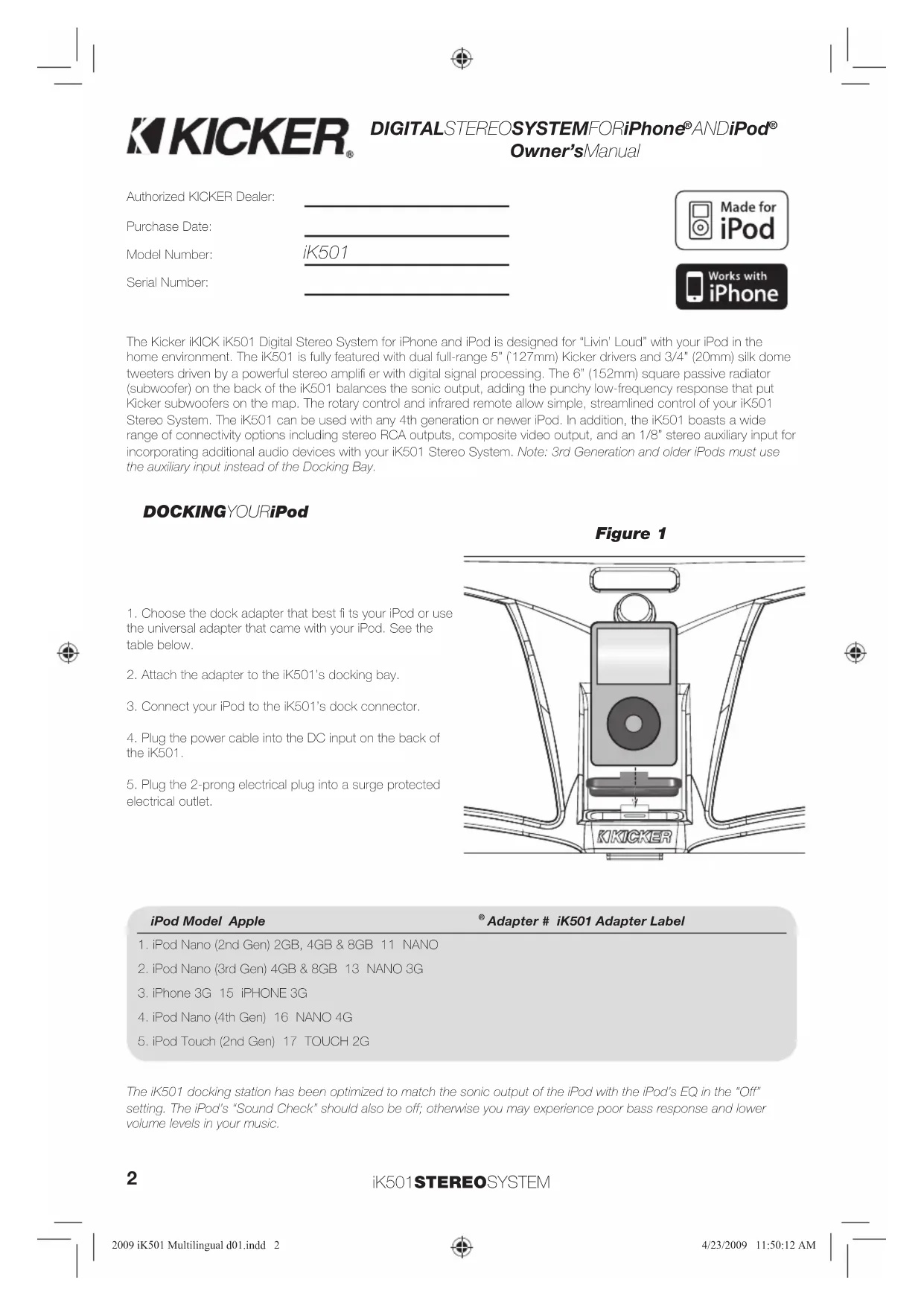 Owner’sManual The Kicker iKICK iK501 Digital Stereo System for iPhone and iPod is designed for “Livin’ Loud” with your iPod in the home environment. The iK501 is fully featured with dual full-range 5” (`127mm) Kicker drivers and 3/4” (20mm) silk dome tweeters driven by a powerful stereo amplifi er with digital signal processing. The 6” (152mm) square passive radiator (subwoofer) on the back of the iK501 balances the sonic output, adding the punchy low-frequency response that put Kicker subwoofers on the map. The rotary control and infrared remote allow simple, streamlined control of your iK501 Stereo System. The iK501 can be used with any 4th generation or newer iPod. In addition, the iK501 boasts a wide range of connectivity options including stereo RCA outputs, composite video output, and an 1/8” stereo auxiliary input for incorporating additional audio devices with your iK501 Stereo System. Note: 3rd Generation and older iPods must use the auxiliary input instead of the Docking Bay. Authorized KICKER Dealer: Purchase Date: Model Number: Serial Number: iPod Model Apple