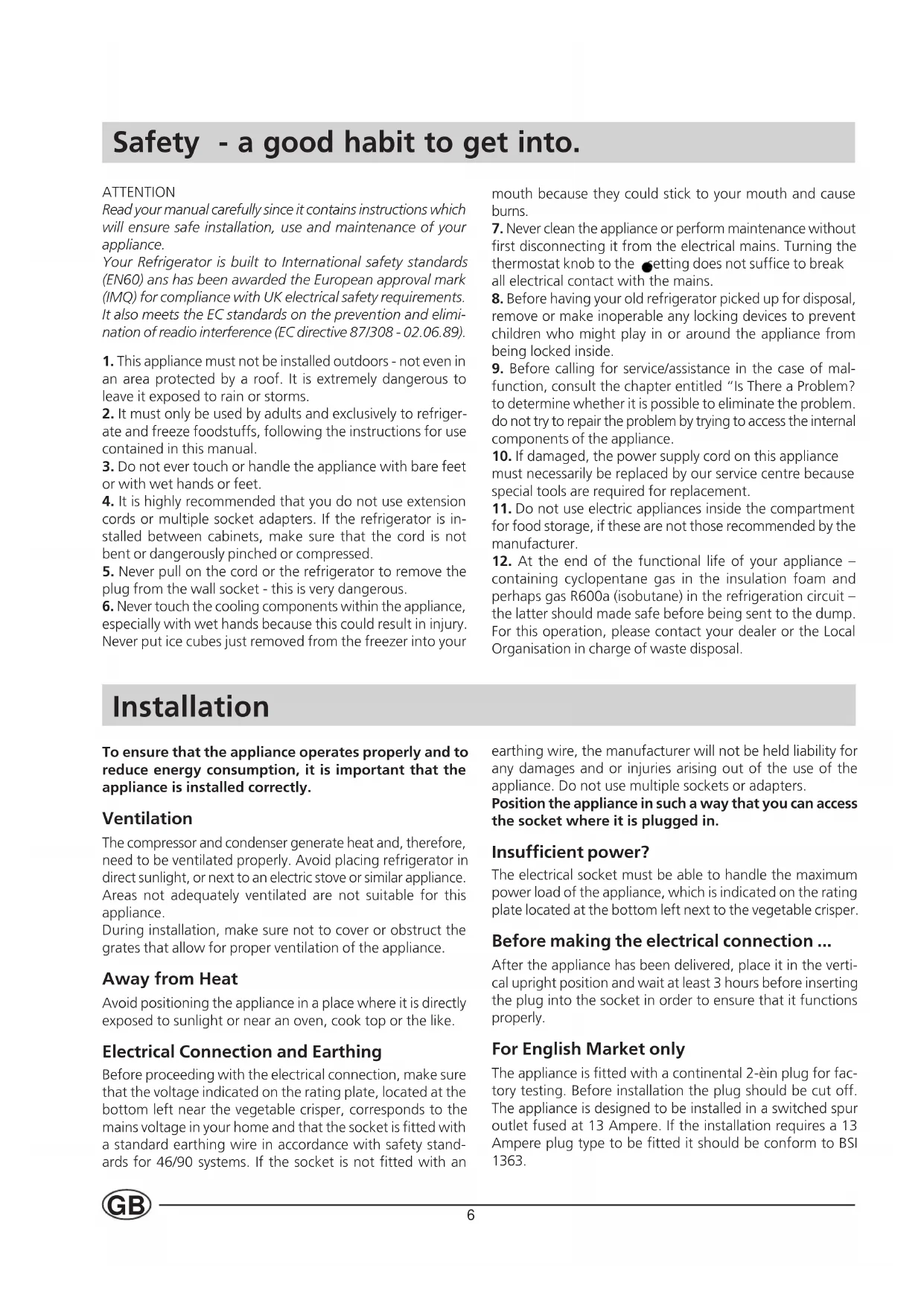 containing cyclopentane gas in the insulation foam and perhaps gas R600a (isobutane) in the refrigeration circuit – the latter should made safe before being sent to the dump. For this operation, please contact your dealer or the Local Organisation in charge of waste disposal. Installation To ensure that the appliance operates properly and to reduce energy consumption, it is important that the appliance is installed correctly. Ventilation The compressor and condenser generate heat and, therefore, need to be ventilated properly. Avoid placing refrigerator in direct sunlight, or next to an electric stove or similar appliance. Areas not adequately ventilated are not suitable for this appliance. During installation, make sure not to cover or obstruct the grates that allow for proper ventilation of the appliance. Away from Heat Avoid positioning the appliance in a place where it is directly exposed to sunlight or near an oven, cook top or the like. Electrical Connection and Earthing Before proceeding with the electrical connection, make sure that the voltage indicated on the rating plate, located at the bottom left near the vegetable crisper, corresponds to the mains voltage in your home and that the socket is fitted with a standard earthing wire in accordance with safety stand- ards for 46/90 systems. If the socket is not fitted with an earthing wire, the manufacturer will not be held liability for any damages and or injuries arising out of the use of the appliance. Do not use multiple sockets or adapters. Position the appliance in such a way that you can access the socket where it is plugged in. Insufficient power? The electrical socket must be able to handle the maximum power load of the appliance, which is indicated on the rating plate located at the bottom left next to the vegetable crisper. Before making the electrical connection ... After the appliance has been delivered, place it in the verti- cal upright position and wait at least 3 hours before inserting the plug into the socket in order to ensure that it functions properly. For English Market only The appliance is fitted with a continental 2-èin plug for fac- tory testing. Before installation the plug should be cut off. The appliance is designed to be installed in a switched spur outlet fused at 13 Ampere. If the installation requires a 13 Ampere plug type to be fitted it should be conform to BSI
