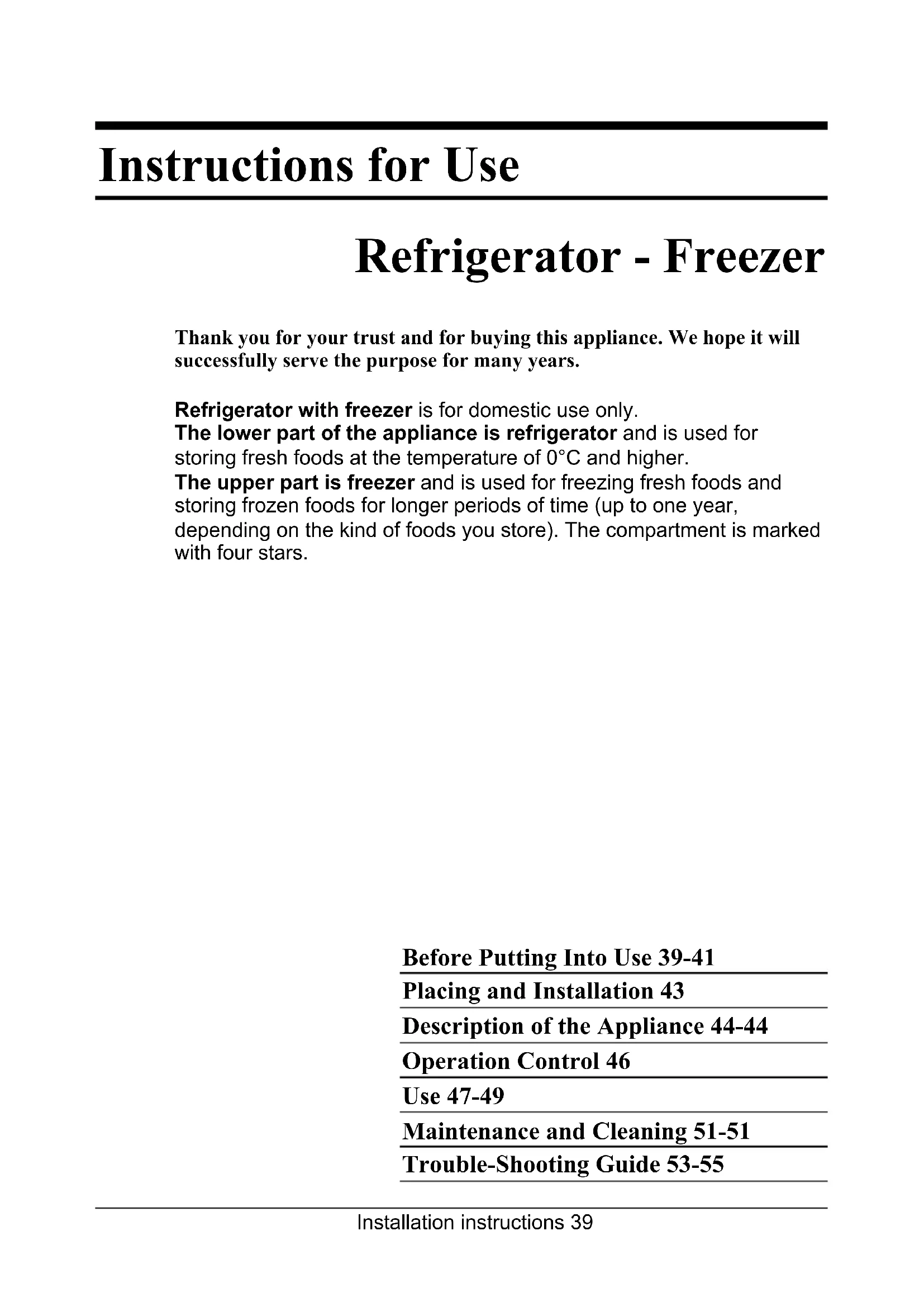 ALTERAÇÕES QUE NÃO COMPROMETAM A FUCIONALIDADE DO APARELHO.Installation instructions 39 Instructions for Use Refrigerator - Freezer Thank you for your trust and for buying this appliance. We hope it will successfully serve the purpose for many years. Refrigerator with freezer is for domestic use only. The lower part of the appliance is refrigerator and is used for storing fresh foods at the temperature of 0°C and higher. The upper part is freezer and is used for freezing fresh foods and storing frozen foods for longer periods of time (up to one year, depending on the kind of foods you store). The compartment is marked with four stars. Before Putting Into Use 39-41 Placing and Installation 43 Description of the Appliance 44-44 Operation Control 46 Use 47-49 Maintenance and Cleaning 51-51 Trouble-Shooting Guide 53-55Installation instructions40 Before Putting Into Use