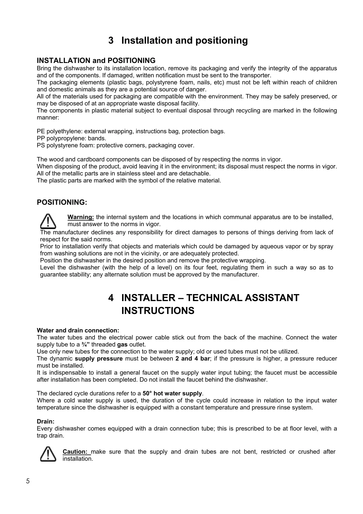 INSTALLATION and POSITIONING Bring the dishwasher to its installation location, remove its packaging and verify the integrity of the apparatus and of the components. If damaged, written notification must be sent to the transporter. The packaging elements (plastic bags, polystyrene foam, nails, etc) must not be left within reach of children and domestic animals as they are a potential source of danger. All of the materials used for packaging are compatible with the environment. They may be safely preserved, or may be disposed of at an appropriate waste disposal facility. The components in plastic material subject to eventual disposal through recycling are marked in the following manner: PE polyethylene: external wrapping, instructions bag, protection bags. PP polypropylene: bands. PS polystyrene foam: protective corners, packaging cover. The wood and cardboard components can be disposed of by respecting the norms in vigor. When disposing of the product, avoid leaving it in the environment; its disposal must respect the norms in vigor. All of the metallic parts are in stainless steel and are detachable. The plastic parts are marked with the symbol of the relative material.