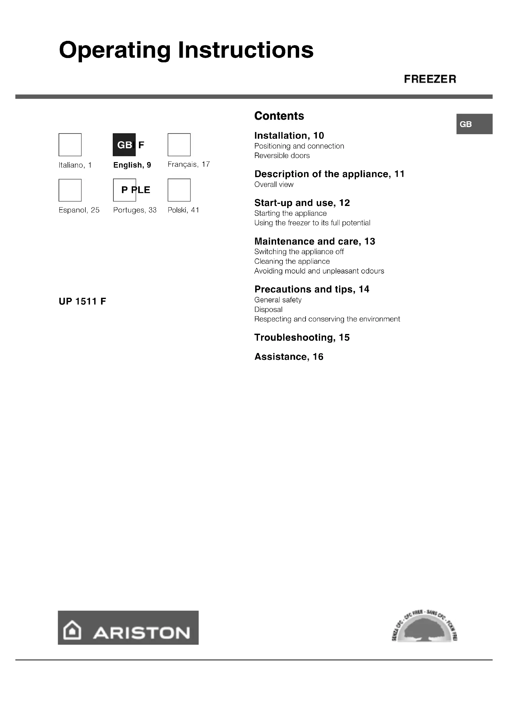 modello numero di serieGB Operating Instructions FREEZER Contents Installation, 10 Positioning and connection Reversible doors Description of the appliance, 11 Overall view Start-up and use, 12 Starting the appliance Using the freezer to its full potential Maintenance and care, 13 Switching the appliance off Cleaning the appliance Avoiding mould and unpleasant odours Precautions and tips, 14 General safety Disposal Respecting and conserving the environment Troubleshooting, 15 Assistance, 16 UP 1511 F Italiano, 1 Français, 17 English, 9 GBI F Portuges , 33 Polski, 41 Espanol, 25 P PLE10