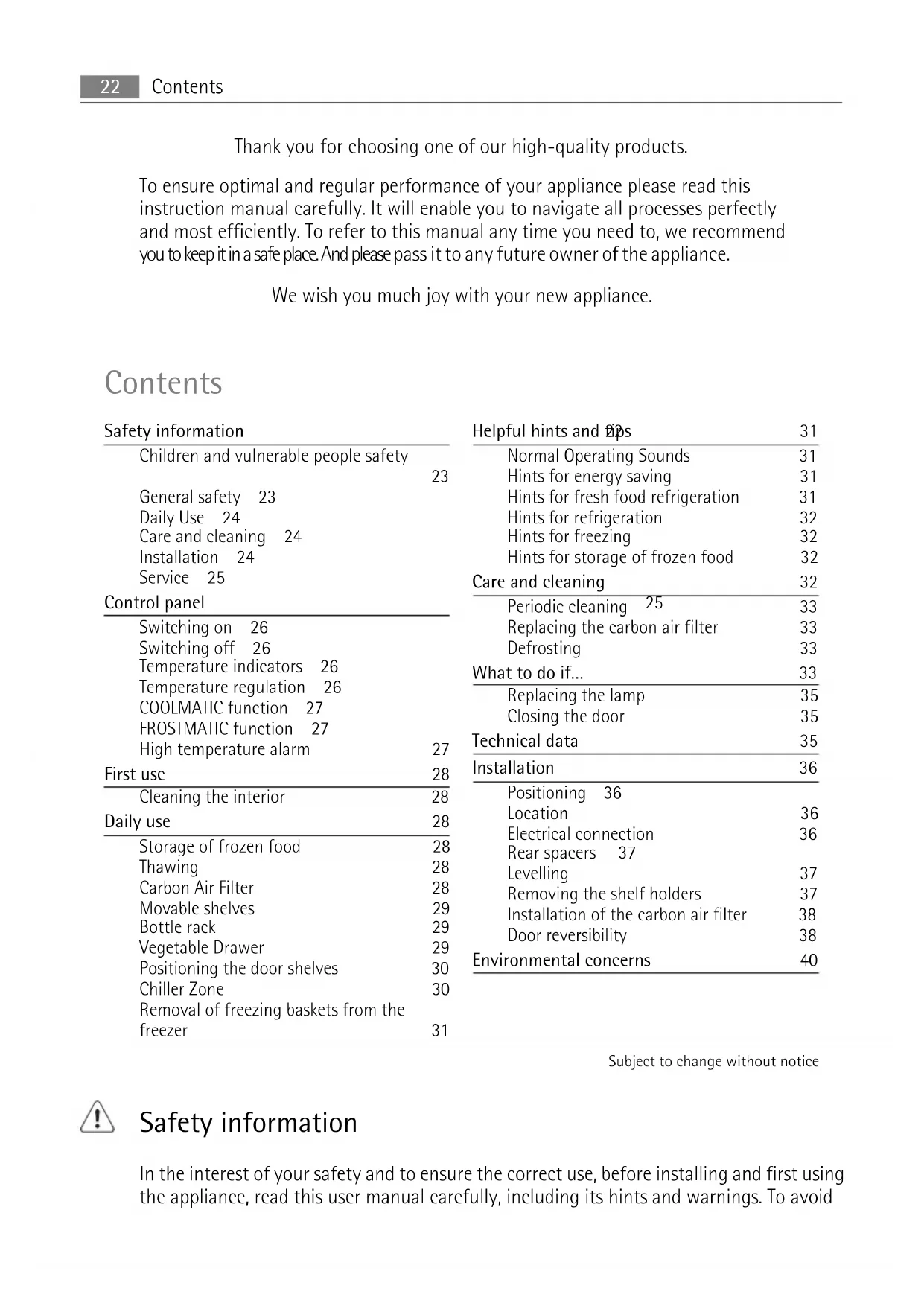 General safety 23 Daily Use 24 Care and cleaning 24 Installation 24 Service 25 Control panel 25 Switching on 26 Switching off 26 Temperature indicators 26 Temperature regulation 26 COOLMATIC function 27 FROSTMATIC function 27 High temperature alarm 27 First use 28 Cleaning the interior 28 Daily use 28 Storage of frozen food 28 Thawing 28 Carbon Air Filter 28 Movable shelves 29 Bottle rack 29 Vegetable Drawer 29 Positioning the door shelves 30 Chiller Zone 30 Removal of freezing baskets from the freezer 31 Helpful hints and tips 31 Normal Operating Sounds 31 Hints for energy saving 31 Hints for fresh food refrigeration 31 Hints for refrigeration 32 Hints for freezing 32 Hints for storage of frozen food 32 Care and cleaning 32 Periodic cleaning 33 Replacing the carbon air filter 33 Defrosting 33 What to do if… 33 Replacing the lamp 35 Closing the door 35 Technical data 35 Installation 36 Positioning 36 Location 36 Electrical connection 36 Rear spacers 37 Levelling 37 Removing the shelf holders 37 Installation of the carbon air filter 38 Door reversibility 38 Environmental concerns 40 Subject to change without notice Safety information In the interest of your safety and to ensure the correct use, before installing and first using the appliance, read this user manual carefully, including its hints and warnings. To avoid