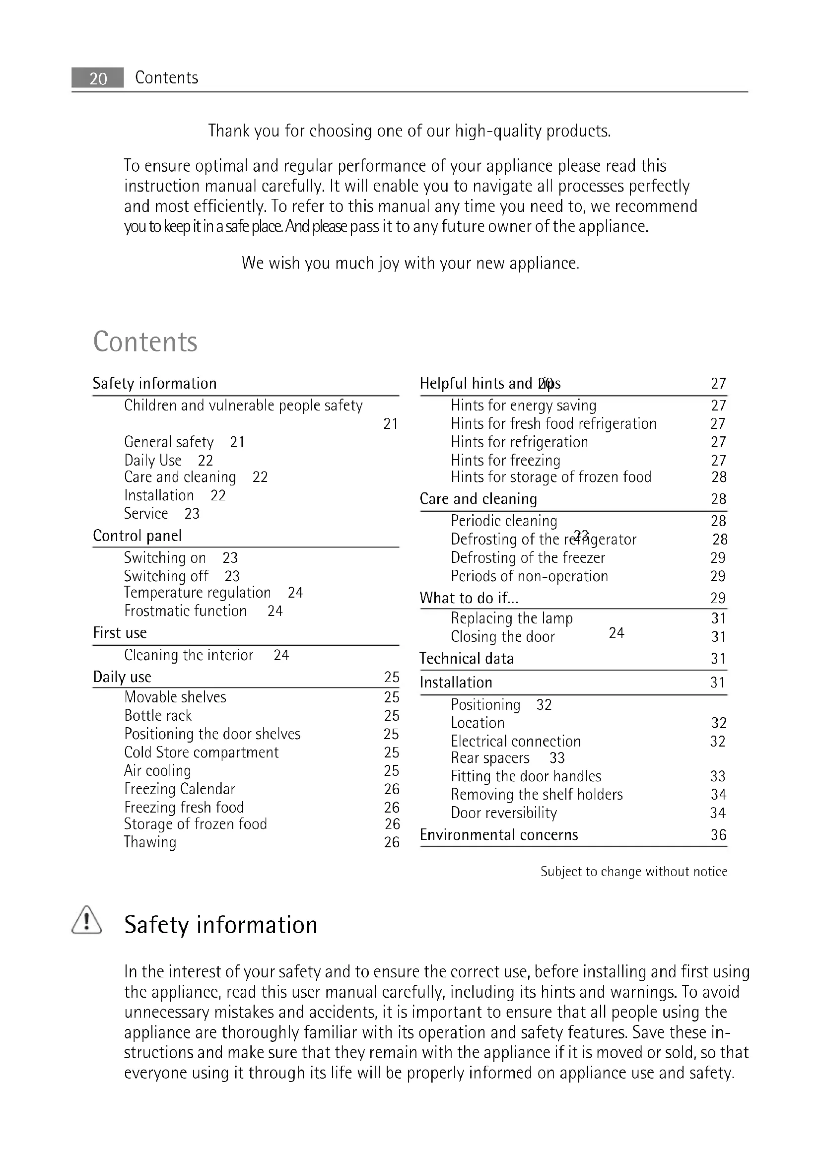 General safety 21 Daily Use 22 Care and cleaning 22 Installation 22 Service 23 Control panel 23 Switching on 23 Switching off 23 Temperature regulation 24 Frostmatic function 24 First use 24 Cleaning the interior 24 Daily use 25 Movable shelves 25 Bottle rack 25 Positioning the door shelves 25 Cold Store compartment 25 Air cooling 25 Freezing Calendar 26 Freezing fresh food 26 Storage of frozen food 26 Thawing 26 Helpful hints and tips 27 Hints for energy saving 27 Hints for fresh food refrigeration 27 Hints for refrigeration 27 Hints for freezing 27 Hints for storage of frozen food 28 Care and cleaning 28 Periodic cleaning 28 Defrosting of the refrigerator 28 Defrosting of the freezer 29 Periods of non-operation 29 What to do if… 29 Replacing the lamp 31 Closing the door 31 Technical data 31 Installation 31 Positioning 32 Location 32 Electrical connection 32 Rear spacers 33 Fitting the door handles 33 Removing the shelf holders 34 Door reversibility 34 Environmental concerns 36 Subject to change without notice Safety information In the interest of your safety and to ensure the correct use, before installing and first using the appliance, read this user manual carefully, including its hints and warnings. To avoid unnecessary mistakes and accidents, it is important to ensure that all people using the appliance are thoroughly familiar with its operation and safety features. Save these in- structions and make sure that they remain with the appliance if it is moved or sold, so that everyone using it through its life will be properly informed on appliance use and safety.