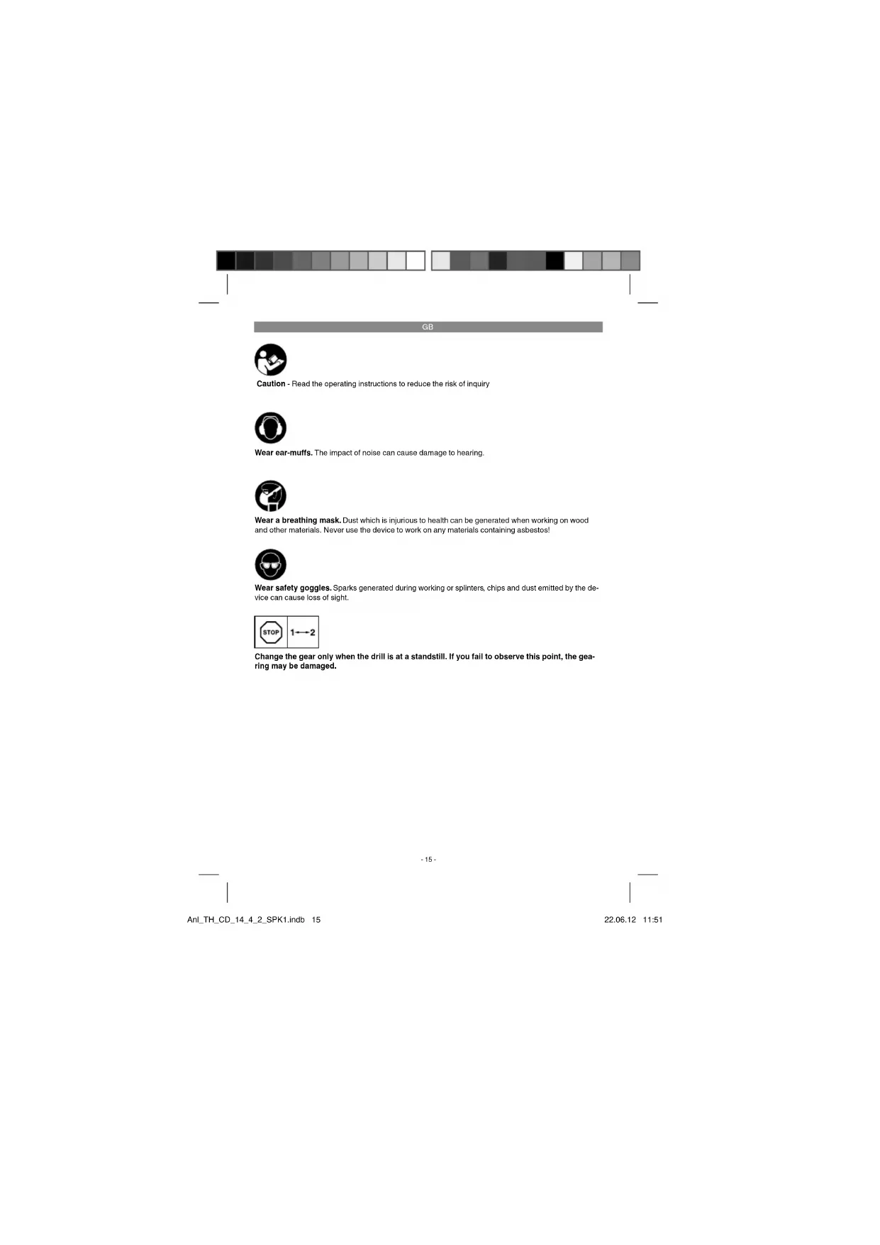 Caution - Read the operating instructions to reduce the risk of inquiry Wear ear-muff s. The impact of noise can cause damage to hearing. Wear safety goggles. Sparks generated during working or splinters, chips and dust emitted by the de- vice can cause loss of sight. Wear a breathing mask. Dust which is injurious to health can be generated when working on wood and other materials. Never use the device to work on any materials containing asbestos! Change the gear only when the drill is at a standstill. If you fail to observe this point, the gea- ring may be damaged. Anl_TH_CD_14_4_2_SPK1.indb 15Anl_TH_CD_14_4_2_SPK1.indb 15 22.06.12 11:5122.06.12 11:51GB