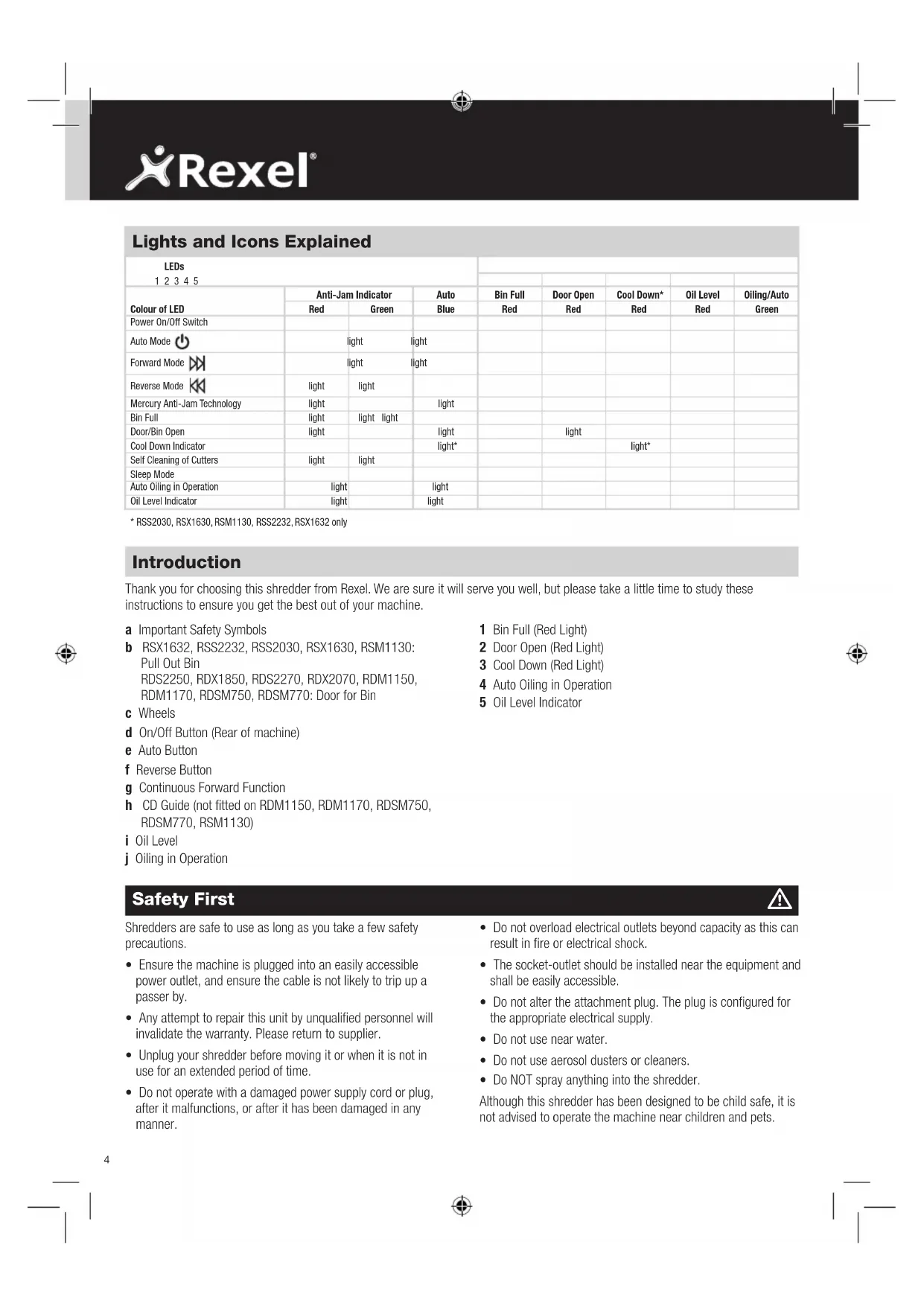 Introduction Thank you for choosing this shredder from Rexel. We are sure it will serve you well, but please take a little time to study these instructions to ensure you get the best out of your machine. a Important Safety Symbols b RSX1632, RSS2232, RSS2030, RSX1630, RSM1130: Pull Out Bin RDS2250, RDX1850, RDS2270, RDX2070, RDM1150, RDM1170, RDSM750, RDSM770: Door for Bin c Wheels d On/Off Button (Rear of machine) e Auto Button f Reverse Button g Continuous Forward Function h CD Guide (not fitted on RDM1150, RDM1170, RDSM750, RDSM770, RSM1130) i Oil Level j Oiling in Operation 1 Bin Full (Red Light) 2 Door Open (Red Light) 3 Cool Down (Red Light) 4 Auto Oiling in Operation 5 Oil Level Indicator Safety First Shredders are safe to use as long as you take a few safety precautions.