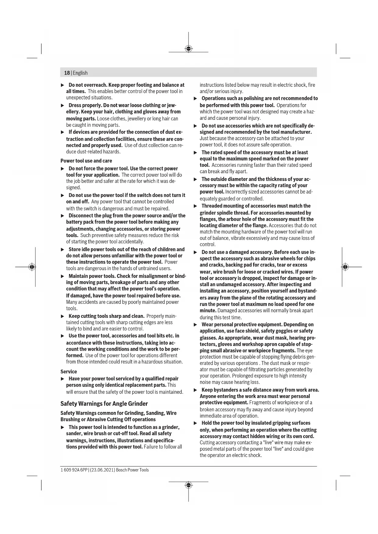 The vibration level given in these instructions has been measured in accordance with a standardised measuring pro- cedure and may be used to compare power tools. It can also be used for a preliminary estimation of exposure to vibra- tion. 1 609 92A 6PP | (23.06.2021) Bosch Power ToolsEnglish | 23 The stated vibration level applies to the main applications of the power tool. However, if the power tool is used for differ- ent applications, with different application tools or poorly maintained, the vibration level may differ. This can signific- antly increase the exposure to vibration over the total work- ing period. To estimate the exposure to vibration accurately, the times when the tool is switched off or when it is running but not ac- tually being used should also be taken into account. This can significantly reduce the exposure to vibration over the total working period. Implement additional safety measures to protect the oper- ator from the effects of vibration, such as servicing the power tool and application tools, keeping the hands warm, and organising workflows correctly. Fitting Fitting Protective Equipment u Pull the plug out of the socket before carrying out any work on the power tool. Note: If the grinding disc breaks during operation or the holding fixtures on the protective guard/power tool become damaged, the power tool must be sent to the after-sales ser- vice immediately; see the "After-Sales Service and Applica- tion Service" section for addresses. Protective guard for grinding Place the protective guard (8) onto the holder on the power tool until the coding cams of the protective guard are aligned with the holder. When doing so, press and hold the unlocking lever (1). Press the protective guard (8) onto the spindle collar un- til the shoulder of the pro- tective guard is sitting on the flange of the power tool and rotate the protective guard until it audibly clicks into place. Adjust the position of the protective guard (8) to meet the requirements of the operation. To do this, push the unlock- ing lever (1) upward and rotate the protective guard (8) into the required position. u Always position the protective guard(8) such that the two cams on the unlocking lever(1) engage in the corresponding openings on the protective guard(8). u Adjust the protective guard (8) such that sparking in the direction of the operator is prevented. u The protective guard (8) must only be adjustable while the unlocking lever (1) is actuated. Otherwise, the power tool must not be used any more under any circumstances and must be sent to the after-sales ser- vice. Note: The coding cams on the protective guard (8) ensure that only a protective guard that is suitable for the power tool can be fitted. Extraction guard for sanding The extraction guard (7) can be used to minimise dust when sanding paint, varnish and plastics in conjunction with the carbide grinding head (11). The extraction guard (7) is not suitable for working metals. A suitable Bosch vacuum cleaner can be connected to the extraction guard (7). The extraction guard (7) is mounted in the same manner as the protective guard (8). The brush collar can be replaced. Protective guard for cutting u Always use the protective guard for cutting (9) when cutting with bonded abrasives. u Provide sufficient dust extraction when cutting stone. The protective guard for cutting (9) is fitted in the same way as the protective guard for grinding (8). Extraction guard for cutting with a guide block The extraction guard for cutting with a guide block (19) is fit- ted in the same way as the protective guard for grinding. Hand guard u Always fit the hand guard (21) when working with the rubber sanding plate (22) or with the cup brush/disc brush/flap disc. Attach the hand guard (21) to the side handle (6). Side handle u Do not operate your power tool without the side handle (6). Screw the side handle (6) on the left or right of the machine head depending on how your are working. Low-vibration auxiliary handle The low-vibration auxiliary handle reduces vibration, enabling the tool to be used safely and more comfort- ably. u Do not make any alterations of any kind to the auxili- ary handle. Do not continue to use a damaged auxiliary handle. Fitting the Abrasive Tools u Pull the plug out of the socket before carrying out any work on the power tool. u Do not touch grinding and cutting discs until they have cooled down. The discs can become very hot while work- ing. Clean the grinding spindle (18) and all the parts to be fitted. Lock the grinding spindle with the spindle lock button (2) before clamping and releasing the abrasive tools. Bosch Power Tools 1 609 92A 6PP | (23.06.2021)24 | English u Do not press the spindle lock button while the grind- ing spindle is moving. The power tool may become dam- aged if you do this. Grinding/cutting disc Pay attention to the dimensions of the abrasive tools. The diameter of the hole must match that of the mounting flange. Do not use an adapter or reducer. When using diamond cutting discs, ensure that the arrow in- dicating the direction of rotation on the diamond cutting disc matches the direction of rotation of the power tool (see the direction of rotation arrow on the machine head). See the graphics page for assembly instructions. To fasten the grinding/cutting disc, screw on the clamping nut(15) and tighten with the two-hole spanner. (see " Quick- clamping nut ", page24). u After fitting the abrasive tool, check that the abrasive tool is fitted correctly and can turn freely before switching on the power tool. Make sure that the abras- ive tool does not brush against the protective guard or other parts. A plastic part (O-ring) is fitted around the cent- ring collar in the mounting flange (10). If the O-ring is missing or damaged, the mounting flange (10) must be replaced before operation can resume. Flap disc u Always fit the hand guard (21) when working with the flap disc. Rubber sanding pad u Always fit the hand gu
