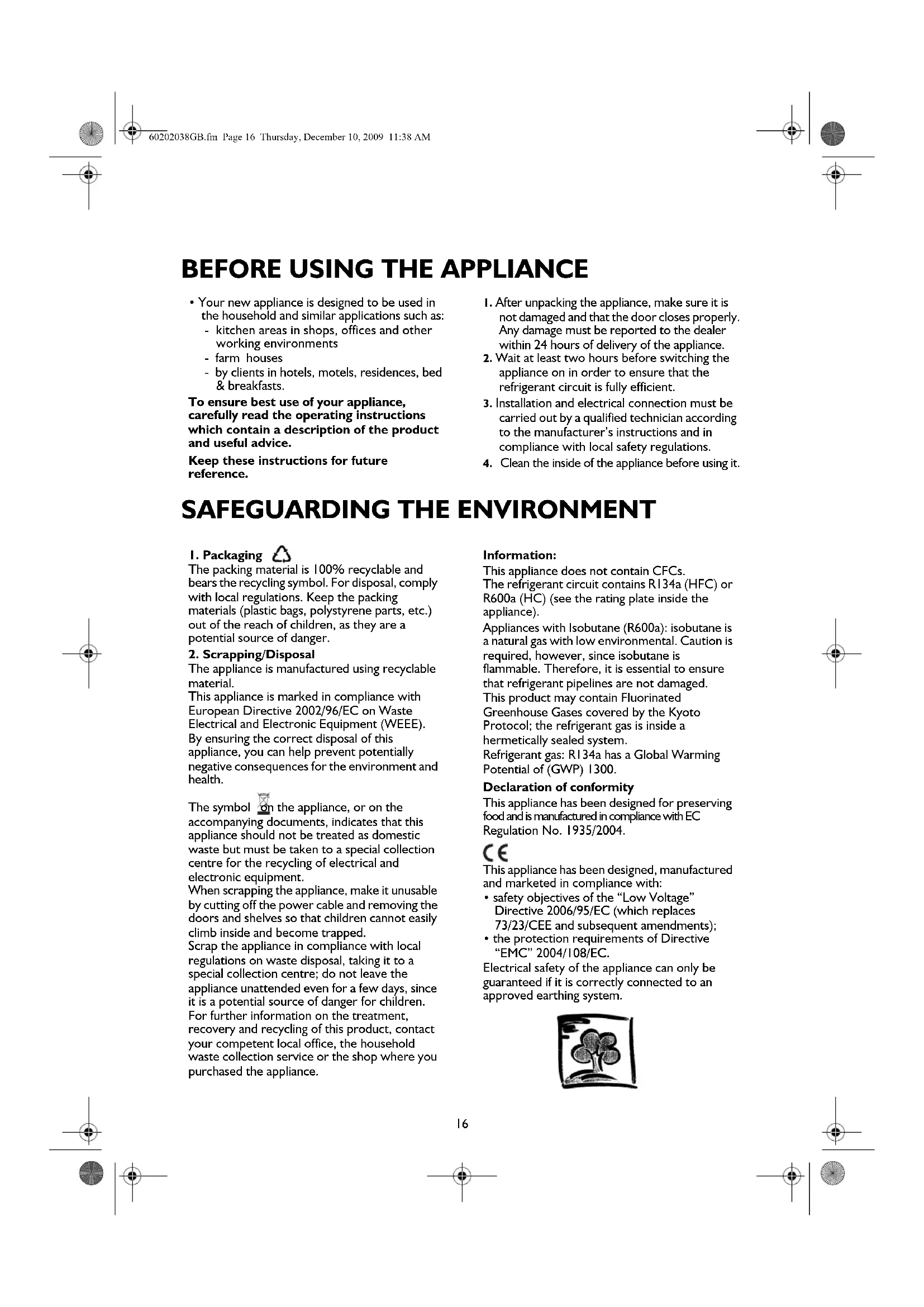 The appliance is manufactured using recyclable material. This appliance is marked in compliance with European Directive 2002/96/EC on Waste Electrical and Electronic Equipment (WEEE). By ensuring the correct disposal of this appliance, you can help prevent potentially negative consequences for the environment and health. The symbol on the appliance, or on the accompanying documents, indicates that this appliance should not be treated as domestic waste but must be taken to a special collection centre for the recycling of electrical and electronic equipment. When scrapping the appliance, make it unusable by cutting off the power cable and removing the doors and shelves so that children cannot easily climb inside and become trapped. Scrap the appliance in compliance with local regulations on waste disposal, taking it to a special collection centre; do not leave the appliance unattended even for a few days, since it is a potential source of danger for children. For further information on the treatment, recovery and recycling of this product, contact your competent local office, the household waste collection service or the shop where you purchased the appliance. Information: This appliance does not contain CFCs. The refrigerant circuit contains R134a (HFC) or R600a (HC) (see the rating plate inside the appliance). Appliances with Isobutane (R600a): isobutane is a natural gas with low environmental. Caution is required, however, since isobutane is flammable. Therefore, it is essential to ensure that refrigerant pipelines are not damaged. This product may contain Fluorinated Greenhouse Gases covered by the Kyoto Protocol; the refrigerant gas is inside a hermetically sealed system. Refrigerant gas: R134a has a Global Warming Potential of (GWP) 1300. Declaration of conformity This appliance has been designed for preserving food and is manufactured in compliance with EC Regulation No. 1935/2004. This appliance has been designed, manufactured and marketed in compliance with: