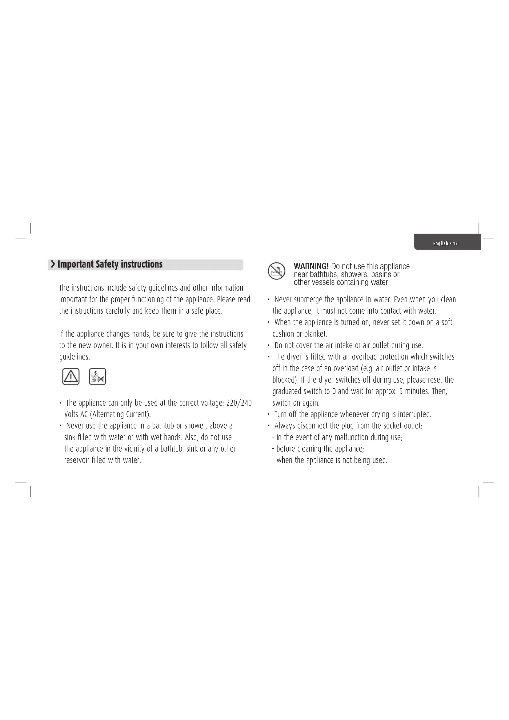 - Never use the appliance in a bathtub or shower, above a sink filled with water or with wet hands. Also, do not use the appliance in the vicinity of a bathtub, sink or any other reservoir filled with water.