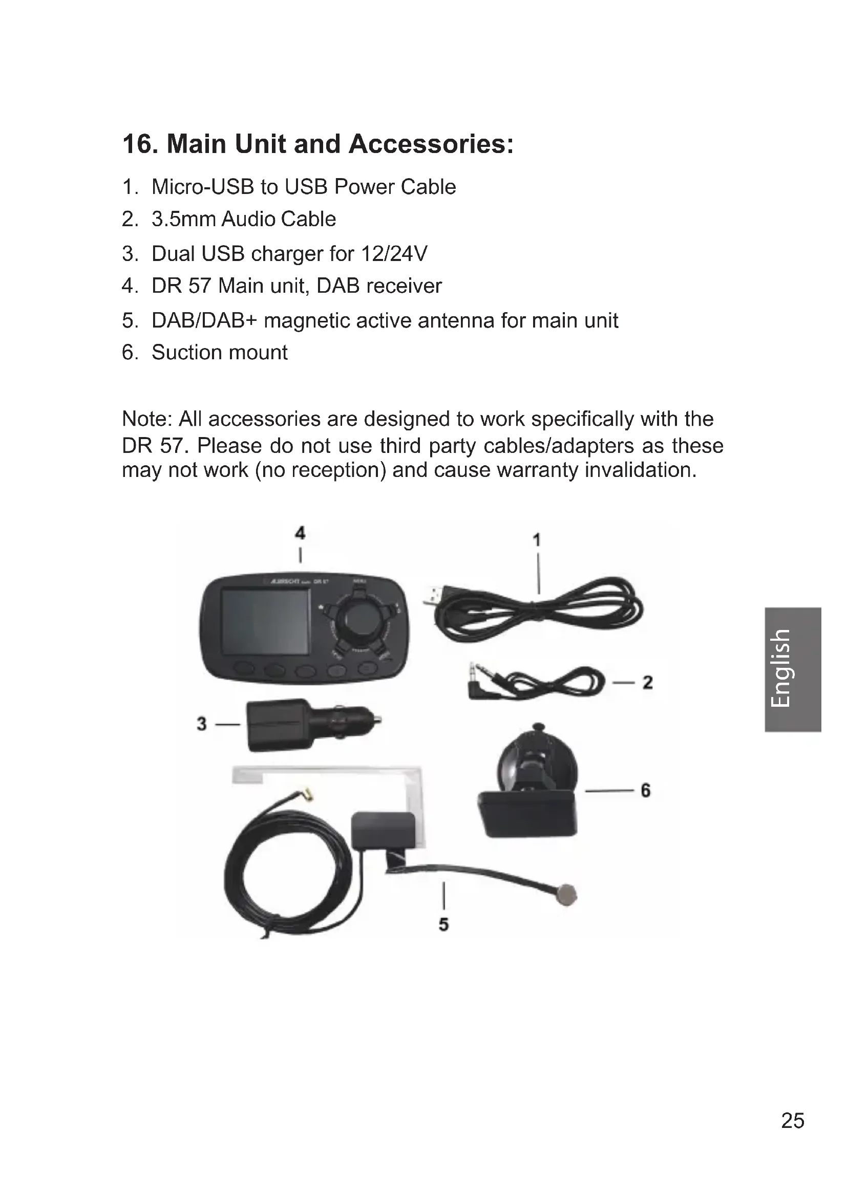 Note: All accessories are designed to work specifically with the DR 57. Please do not use third party cables/adapters as these may not work (no reception) and cause warranty invalidation.