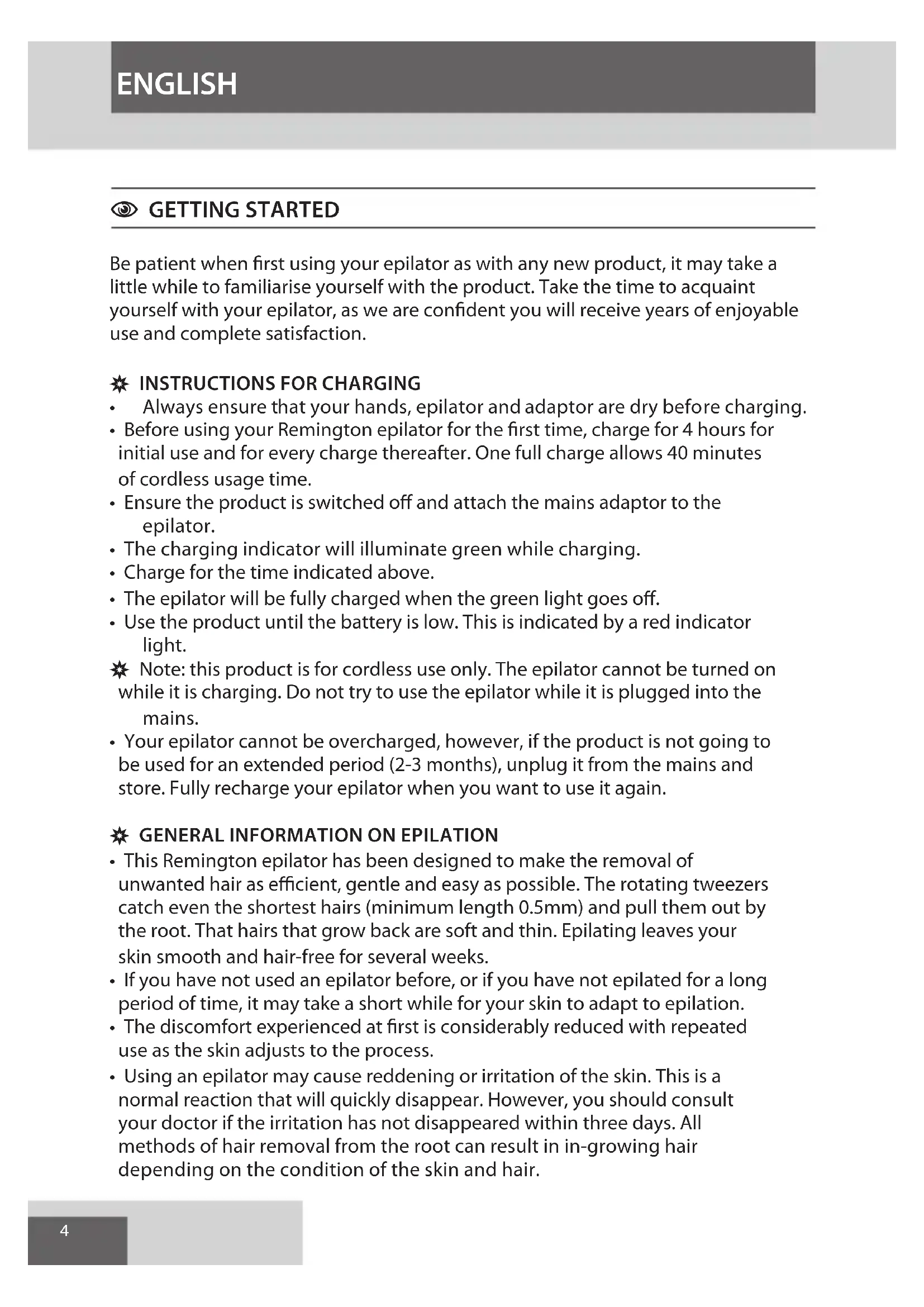 WARNING - TO REDUCE THE RISK OF BURNS, ELECTROCUTION, FIRE OR INJURY TO PERSONS: 1 This appliance can be used by children aged from 8 years and above and persons with reduced physical, sensory or mental capabilities or lack of experience and knowledge if they have been supervised/instructed and understand the hazards involved. Children shall not play with the appliance. Cleaning and user maintenance shall not be done by children unless they are older than 8 and supervised. Keep the appliance and cable out of reach of children under 8 years. 2 This appliance should never be left unattended when plugged into a power outlet, except when charging. 3 Only set the appliance down on a heat-proof surface. 4 Do not use the appliance if it is damaged or malfunctions. 5 If the supply cord of this unit becomes damaged, discontinue use immediately and return the appliance to your nearest authorised Remington service dealer for repair or replacement in order to avoid a hazard. 6 Do not use attachments other than those we supply. 7 Do not twist or kink the cable, or wrap it around the appliance. 8 This product is for cordless use only. Do not use your epilator while it is plugged into the mains. 9 Make sure the power plug and cord do not get wet. 10 Do not plug or unplug the appliance with wet hands. 11 Suitable for use in a bath or shower. 12 Ensure the appliance is switched off and unplugged from the mains before cleaning. 13 Do not use this appliance with a damaged or broken tweezer barrel as injury may occur. 14 This appliance is not intended for commercial or salon use. 15 This appliance should be supplied with approved safety isolating adaptors PA-0510EU (for Europe) and PA-0510U (for United Kingdom) with the output capacity of 5DC; 1000mA (adaptor output). ENGLISH3