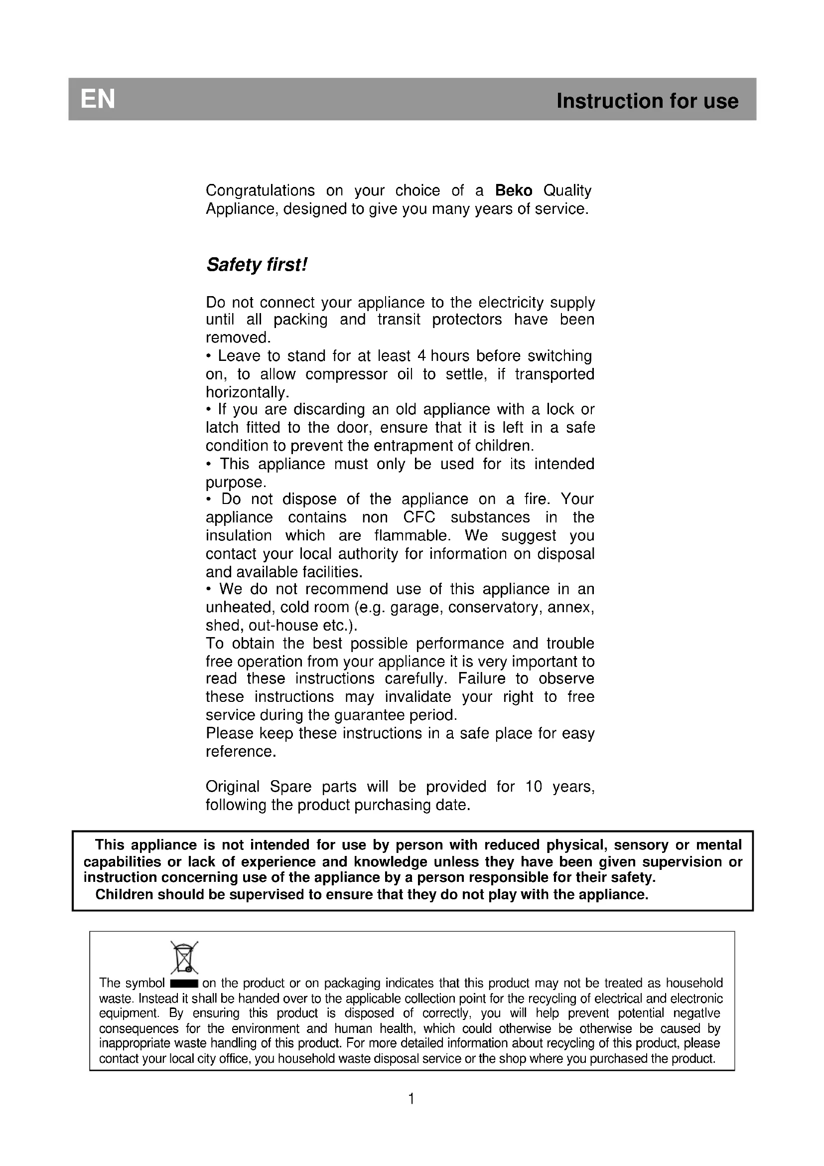 - We do not recommend use of this appliance in an unheated, cold room (e.g. garage, conservatory, annex, shed, out-house etc.). To obtain the best possible performance and trouble free operation from your appliance it is very important to read these instructions carefully. Failure to observe these instructions may invalidate your right to free service during the guarantee period. Please keep these instructions in a safe place for easy reference. Original Spare parts will be provided for 10 years, following the product purchasing date.