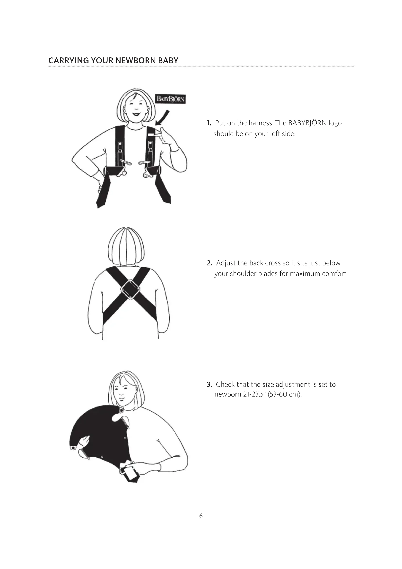 1. Put on the harness. The BABYBJÖRN logo