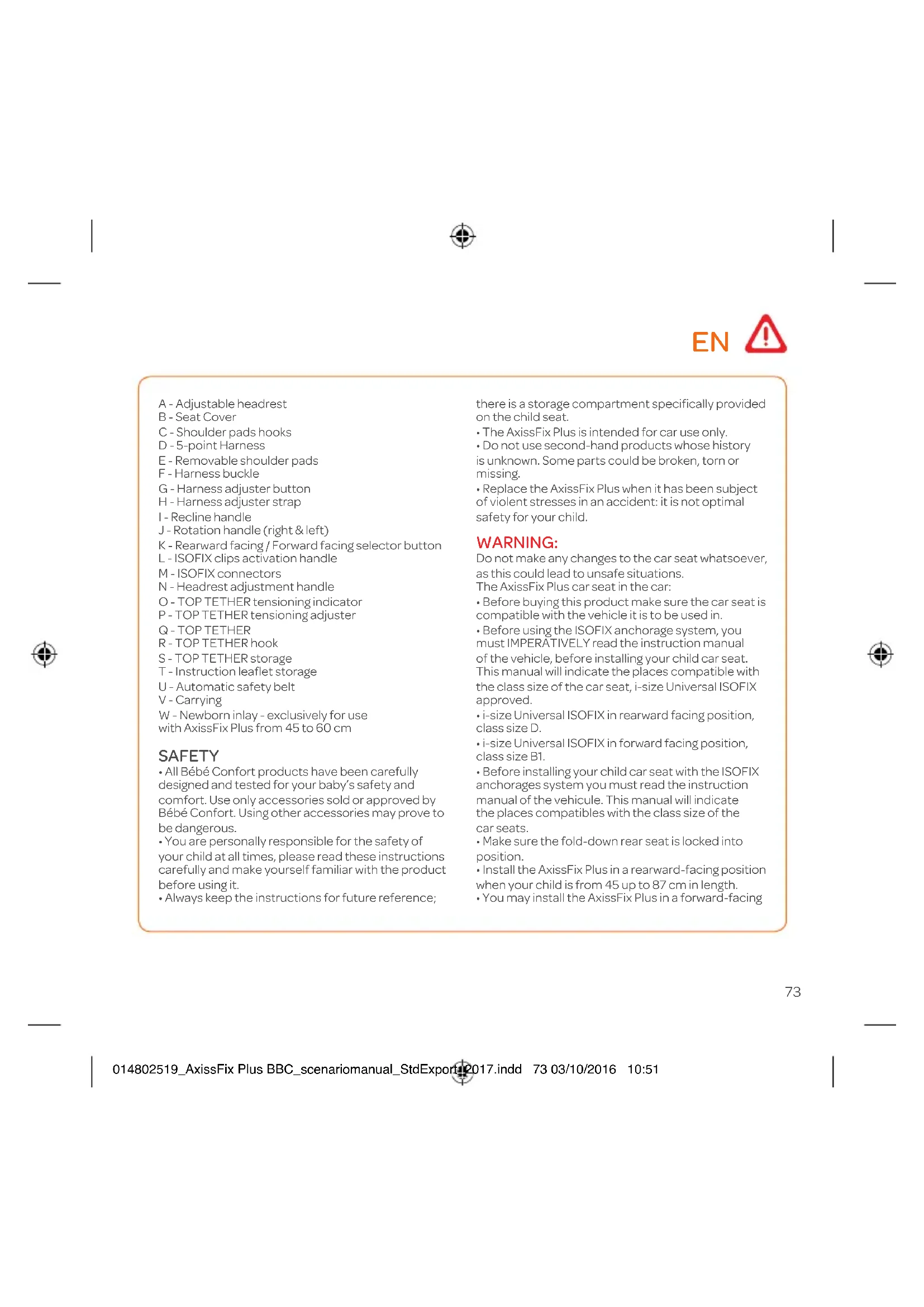 R - TOP TETHER hook S - TOP TETHER storage T - Instruction leaflet storage U - Automatic safety belt V - Carrying W - Newborn inlay - exclusively for use with AxissFix Plus from 45 to 60 cm SAFETY