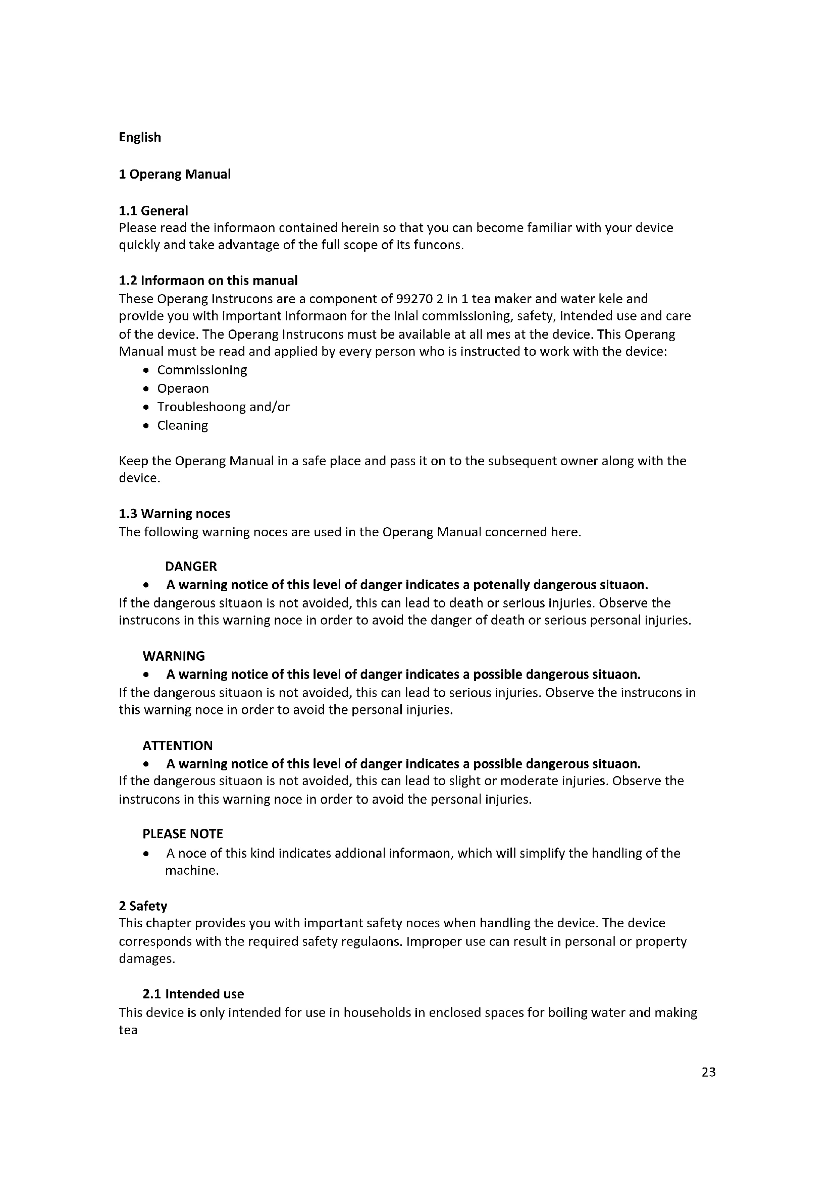 These Operating Instructions are a component of 99270 2 in 1 tea maker and water kettle and provide you with important information for the initial commissioning, safety, intended use and care of the device. The Operating Instructions must be available at all times at the device. This Operating Manual must be read and applied by every person who is instructed to work with the device: Commissioning Operation Troubleshooting and/or Cleaning Keep the Operating Manual in a safe place and pass it on to the subsequent owner along with the device.