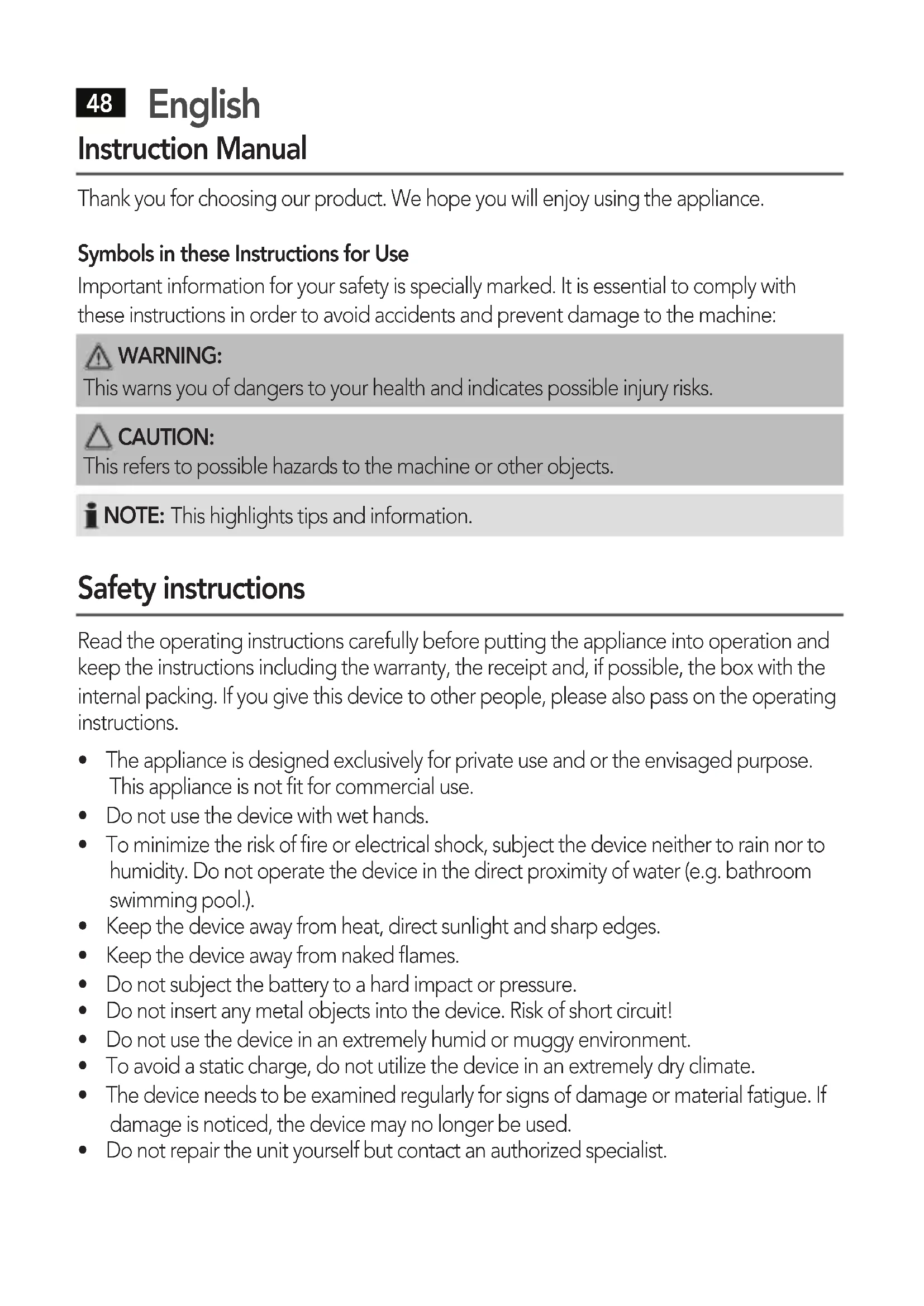 Read the operating instructions carefully before putting the appliance into operation and keep the instructions including the warranty, the receipt and, if possible, the box with the internal packing. If you give this device to other people, please also pass on the operating instructions.