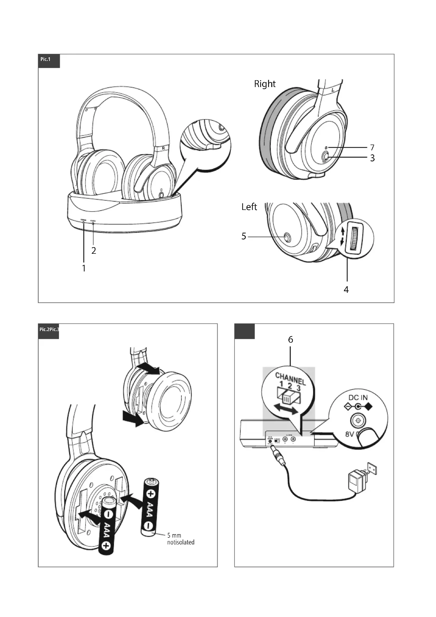 - Switch on the headphones by pressing the Power button (3). The LED (7) of the headphones lights up green. Make sure that the red LED (2) is lit. This conrms that the rechargeable batteries are charged.