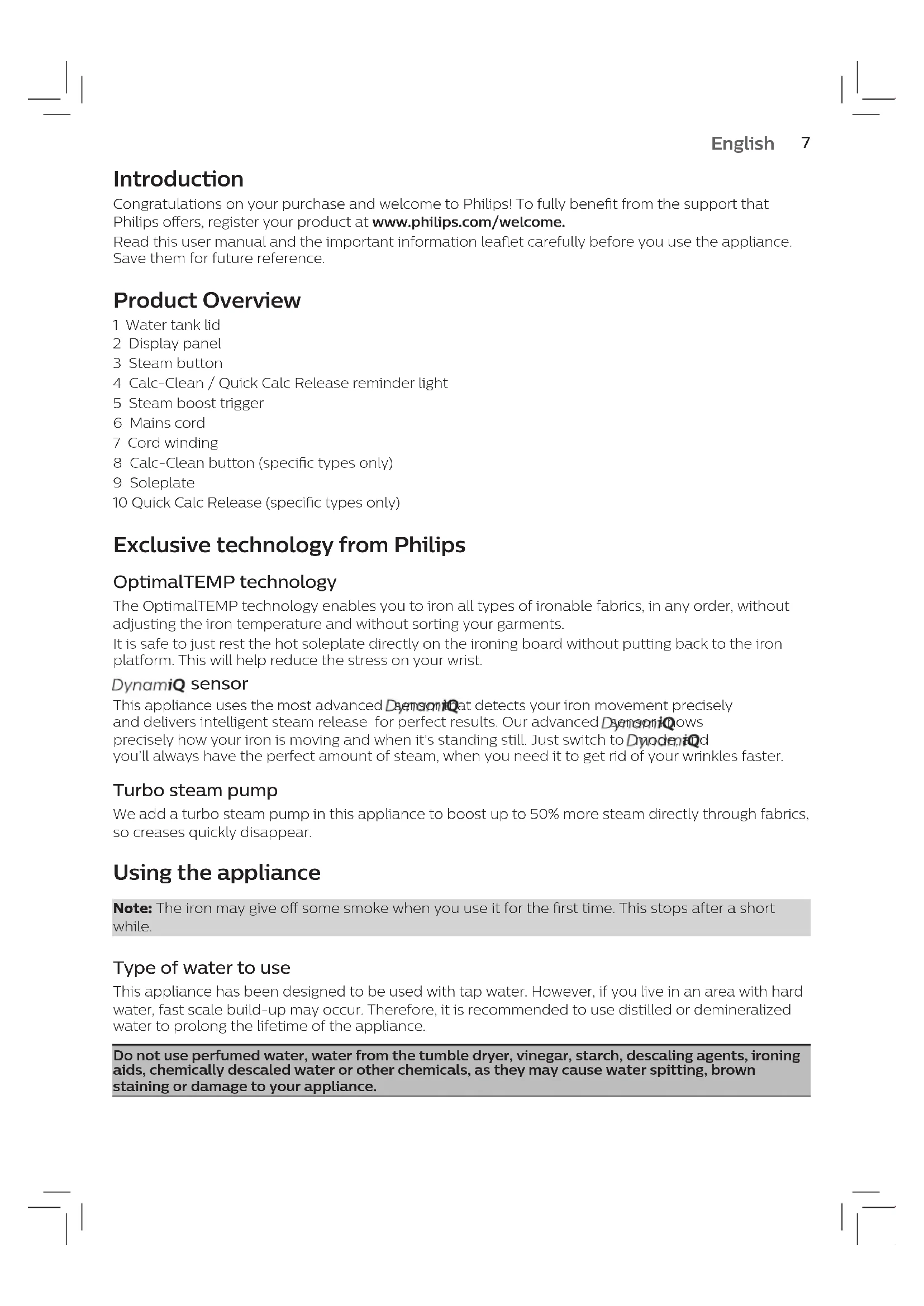 3-8 3-4 3-5 3-3 ~2 min. 3-6 3-7 EN To store DE Aufbewahrung FR Rangement NL Instructies voor opslag DA Opbevaring FI Säilytys NO Lagring SV Förvaring IT Conservazione ES Para guardar PT Para armazenar VI ĐểbảoquảnIntroduction Congratulations on your purchase and welcome to Philips! To fully benet from the support that Philips oers, register your product at www.philips.com/welcome. Read this user manual and the important information leaet carefully before you use the appliance. Save them for future reference. Product Overview 1 Water tank lid 2 Display panel 3 Steam button 4 Calc-Clean / Quick Calc Release reminder light 5 Steam boost trigger 6 Mains cord 7 Cord winding 8 Calc-Clean button (specic types only) 9 Soleplate 10 Quick Calc Release (specic types only) Exclusive technology from Philips OptimalTEMP technology The OptimalTEMP technology enables you to iron all types of ironable fabrics, in any order, without adjusting the iron temperature and without sorting your garments. It is safe to just rest the hot soleplate directly on the ironing board without putting back to the iron platform. This will help reduce the stress on your wrist. sensor This appliance uses the most advanced sensor that detects your iron movement precisely and delivers intelligent steam release for perfect results. Our advanced sensor knows precisely how your iron is moving and when it’s standing still. Just switch to mode, and you’ll always have the perfect amount of steam, when you need it to get rid of your wrinkles faster. Turbo steam pump We add a turbo steam pump in this appliance to boost up to 50% more steam directly through fabrics, so creases quickly disappear. Using the appliance Note: The iron may give o some smoke when you use it for the rst time. This stops after a short while. Type of water to use This appliance has been designed to be used with tap water. However, if you live in an area with hard water, fast scale build-up may occur. Therefore, it is recommended to use distilled or demineralized water to prolong the lifetime of the appliance. Do not use perfumed water, water from the tumble dryer, vinegar, starch, descaling agents, ironing aids, chemically descaled water or other chemicals, as they may cause water spitting, brown staining or damage to your appliance.