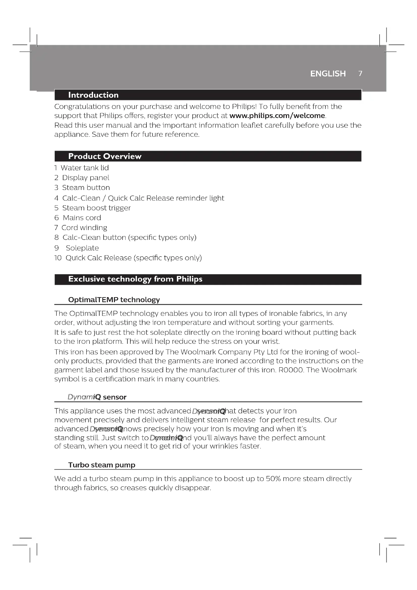 3-8 3-4 3-5 3-3 ~2 min. 3-6 3-7 EN To store DE Aufbewahrung FR Rangement NL Instructies voor opslag DA Opbevaring FI Säilytys NO Lagring SV Förvaring VI Để bảo quản7 ENGLISH Introduction Congratulations on your purchase and welcome to Philips! To fully benet from the support that Philips oers, register your product at www.philips.com/welcome. Read this user manual and the important information leaet carefully before you use the appliance. Save them for future reference. Product Overview 1 Water tank lid 2 Display panel 3 Steam button 4 Calc-Clean / Quick Calc Release reminder light 5 Steam boost trigger 6 Mains cord 7 Cord winding 8 Calc-Clean button (specic types only) 9 Soleplate 10 Quick Calc Release (specic types only) Exclusive technology from Philips OptimalTEMP technology The OptimalTEMP technology enables you to iron all types of ironable fabrics, in any order, without adjusting the iron temperature and without sorting your garments. It is safe to just rest the hot soleplate directly on the ironing board without putting back to the iron platform. This will help reduce the stress on your wrist. This iron has been approved by The Woolmark Company Pty Ltd for the ironing of wool- only products, provided that the garments are ironed according to the instructions on the garment label and those issued by the manufacturer of this iron. R0000. The Woolmark symbol is a certication mark in many countries. sensor This appliance uses the most advanced sensor that detects your iron movement precisely and delivers intelligent steam release for perfect results. Our advanced sensor knows precisely how your iron is moving and when it’s standing still. Just switch to mode, and you’ll always have the perfect amount of steam, when you need it to get rid of your wrinkles faster. Turbo steam pump We add a turbo steam pump in this appliance to boost up to 50% more steam directly through fabrics, so creases quickly disappear.ENGLISH