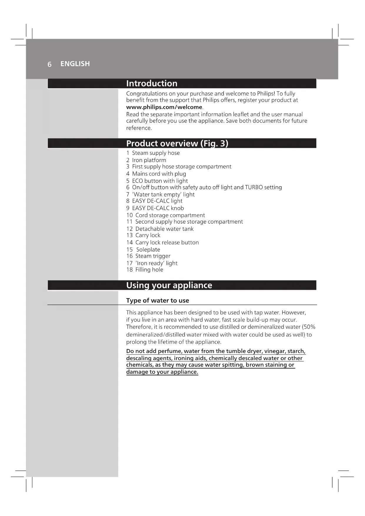 It is very important to perform the descaling procedure as soon as the EASY DE-CALC light starts to ash and the appliance beeps continuously. The EASY DE-CALC light ashes and the appliance beeps continuously after about a month or 10 ironing sessions to indicate that the appliance needs to be descaled. Perform the following descaling procedure before you continue ironing. To avoid the risk of burns, unplug the appliance and let it cool down for at least two hours before you perform the descaling procedure. 1 Remove the plug from the wall socket. 2 Place the appliance on the edge of the tabletop. 3 Hold a cup (with a capacity of at least 350ml) under the EASY DE-CALC knob and turn the knob anticlockwise. 4 Remove the EASY DE-CALC knob and let the water with scale particlesowintothecup. 5 When no more water comes out of the appliance, reinsert the EASY DE-CALC knob and turn it clockwise to fasten it. ENGLISH12 IMPORTANT – Descaling the soleplate If you do not use the EASY DE-CALC function regularly, scale particles may build up in the soleplate and brown stains may come out of the soleplate during ironing. In this situation, you need to descale the soleplate by following the procedure below. We advice you to repeat the procedure twice to better clean the soleplate. To avoid the risk of burns, unplug the appliance and let it cool down for at least two hours before you descale the soleplate. 1 Remove the plug from the wall socket. 2 Place the appliance on the edge of the tabletop. 3 Make sure that the water tank is empty. 4 Hold a cup (with a capacity of at least 350ml) under the EASY DE- CALC knob and turn the knob anticlockwise. 5 Remove the EASY DE-CALC knob and let the water with scale particlesowintothecup. 6 Hold the appliance in the position that EASY DE-CALC opening is facing up and pour 900ml distilled water into the opening. Note: Be mindful on the heavy weight of the appliance when you tilt it. 7 Keep the EASY DE-CALC opening facing up, reinsert the EASY DE- CALC knob and turn it clockwise to fasten it. ENGLISH13ENGLISH 8 Put the appliance back on a stable and even surface. Plug in the appliance and switch it on. 9 Wait for 5 minutes for the appliance to heat up. 10 Keep the steam trigger pressed continuously while you move the iron on a piece of thick cloth for 3 minutes.