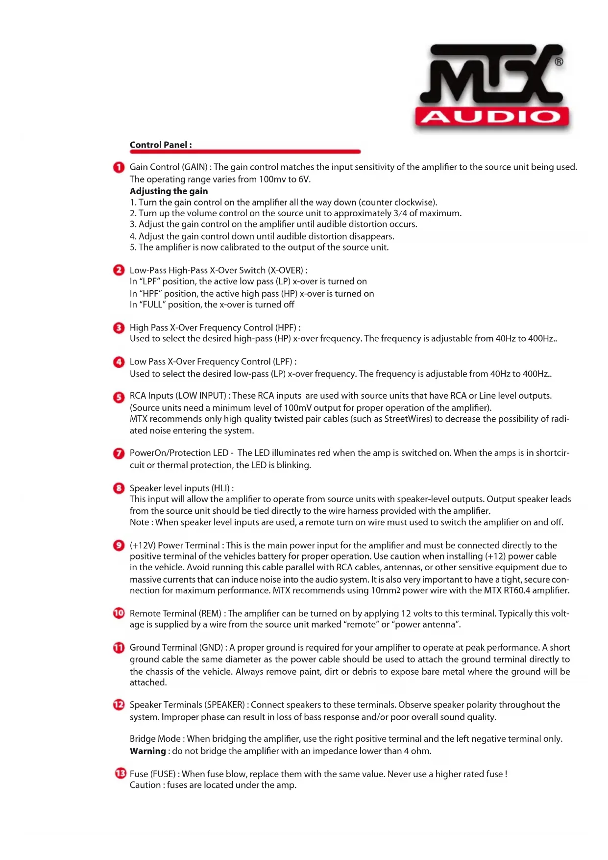 Low-Pass High-Pass X-Over Switch (X-OVER) : In “LPF” position, the active low pass (LP) x-over is turned on In “HPF” position, the active high pass (HP) x-over is turned on In “FULL” position, the x-over is turned o High Pass X-Over Frequency Control (HPF) : Used to select the desired high-pass (HP) x-over frequency. The frequency is adjustable from 40Hz to 400Hz.. Low Pass X-Over Frequency Control (LPF) : Used to select the desired low-pass (LP) x-over frequency. The frequency is adjustable from 40Hz to 400Hz.. RCA Inputs (LOW INPUT) : These RCA inputs are used with source units that have RCA or Line level outputs. (Source units need a minimum level of 100mV output for proper operation of the amplier). MTX recommends only high quality twisted pair cables (such as StreetWires) to decrease the possibility of radi- ated noise entering the system. PowerOn/Protection LED - The LED illuminates red when the amp is switched on. When the amps is in shortcir- cuit or thermal protection, the LED is blinking. Speaker level inputs (HLI) : This input will allow the amplier to operate from source units with speaker-level outputs. Output speaker leads from the source unit should be tied directly to the wire harness provided with the amplifier. Note : When speaker level inputs are used, a remote turn on wire must used to switch the amplier on and o. (+12V) Power Terminal : This is the main power input for the amplier and must be connected directly to the positive terminal of the vehicles battery for proper operation. Use caution when installing (+12) power cable in the vehicle. Avoid running this cable parallel with RCA cables, antennas, or other sensitive equipment due to massive currents that can induce noise into the audio system. It is also very important to have a tight, secure con- nection for maximum performance. MTX recommends using 10mm