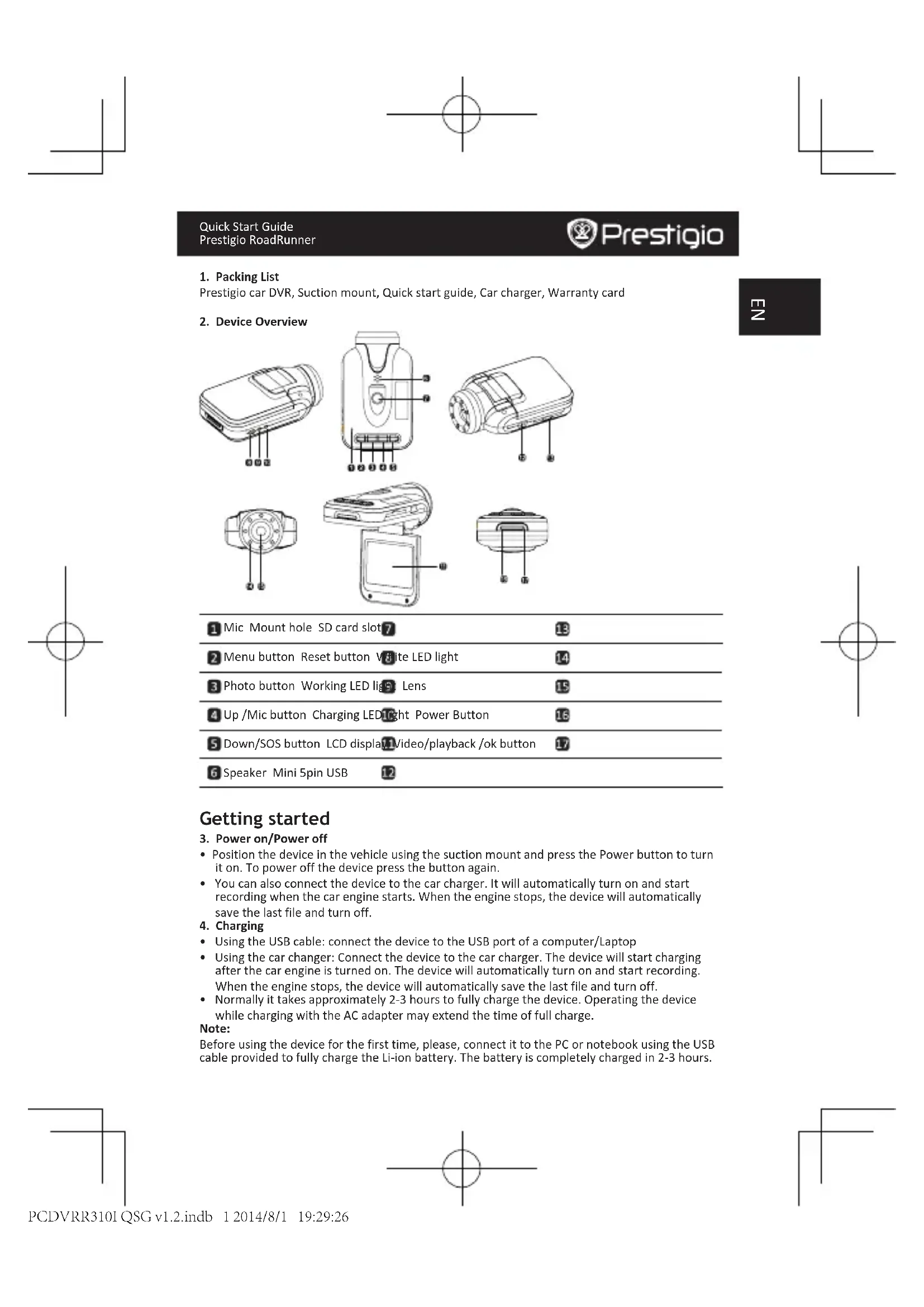 - Normally it takes approximately 2-3 hours to fully charge the device. Operating the device while charging with the AC adapter may extend the time of full charge. Note: Before using the device for the first time, please, connect it to the PC or notebook using the USB cable provided to fully charge the Li-ion battery. The battery is completely charged in 2-3 hours. PCDVRR310I QSG v1.2.indb 1 2014/8/1 19:29:26Quick Start Guide Prestigio RoadRunner