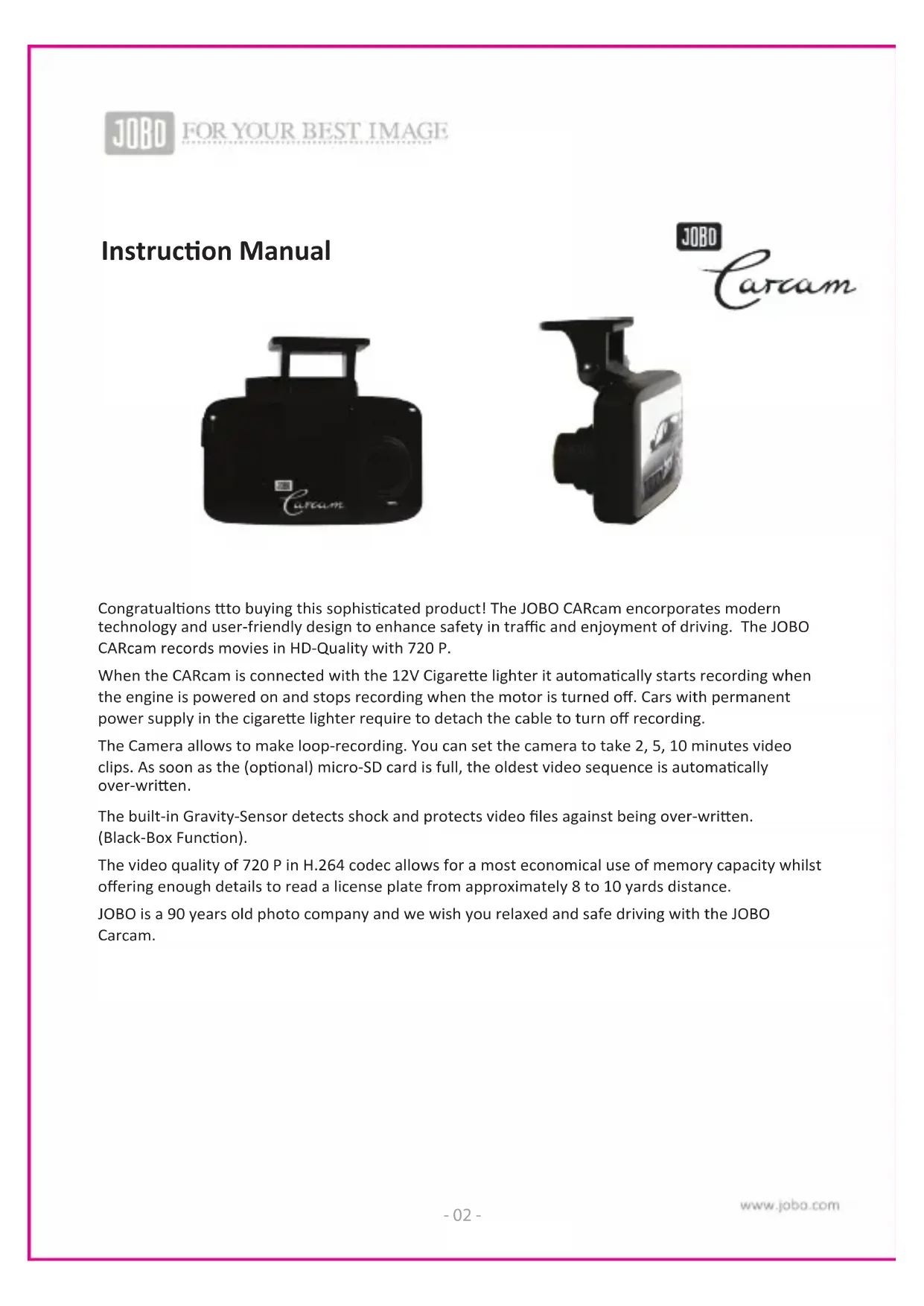 - Gebruiksaanwijzing - 02 - Instrucon Manual Congratualons to buying this sophiscated product! The JOBO CARcam encorporates modern technology and user-friendly design to enhance safety in traffic and enjoyment of driving. The JOBO CARcam records movies in HD-Quality with 720 P. When the CARcam is connected with the 12V Cigaree lighter it automacally starts recording when the engine is powered on and stops recording when the motor is turned off. Cars with permanent power supply in the cigaree lighter require to detach the cable to turn off recording. The Camera allows to make loop-recording. You can set the camera to take 2, 5, 10 minutes video clips. As soon as the (oponal) micro-SD card is full, the oldest video sequence is automacally over-wrien. The built-in Gravity-Sensor detects shock and protects video files against being over-wrien. (Black-Box Funcon). The video quality of 720 P in H.264 codec allows for a most economical use of memory capacity whilst offering enough details to read a license plate from approximately 8 to 10 yards distance. JOBO is a 90 years old photo company and we wish you relaxed and safe driving with the JOBO Carcam.- 03 - p. 32