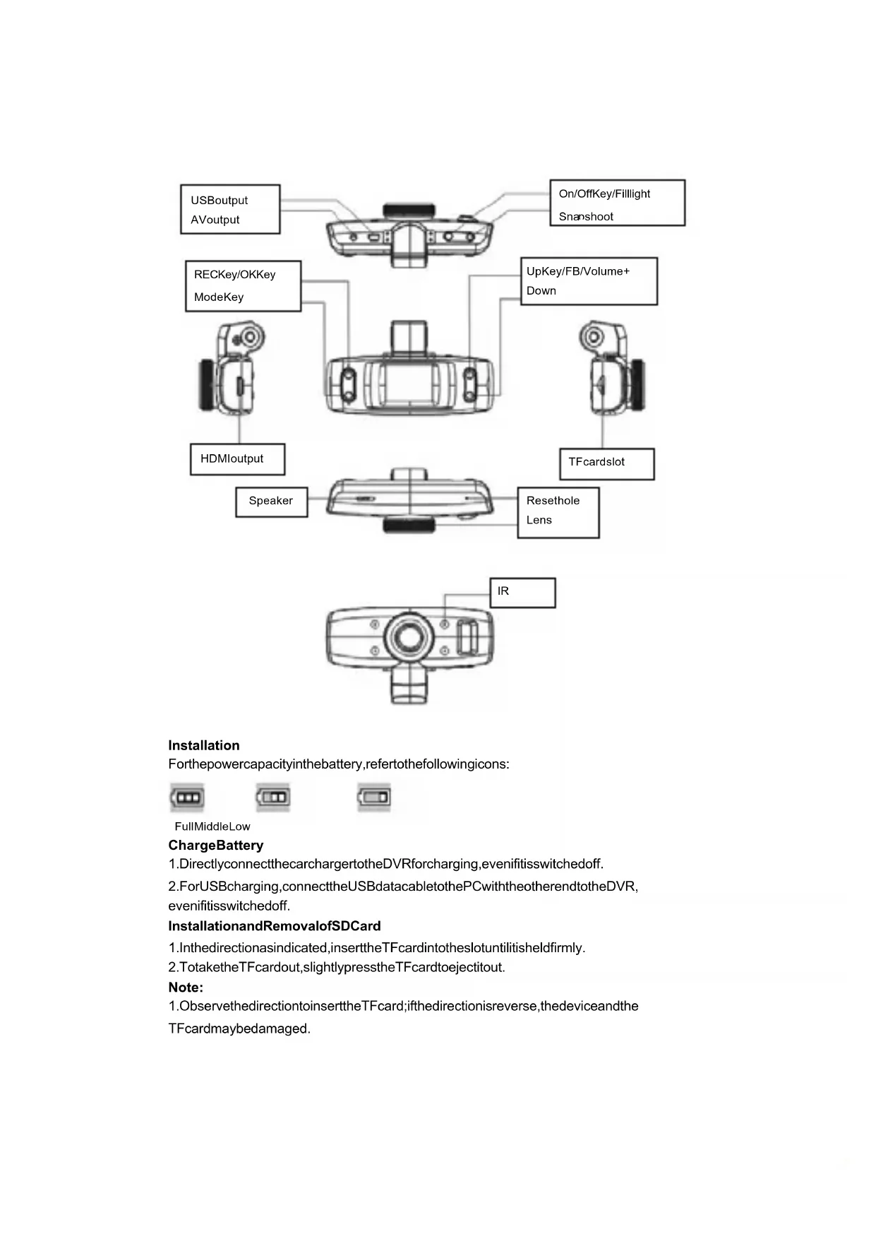 pictures and videos. Tip: Without driver installed, the mobile disc may be used when the DVR is switched on. Remarks: When this device freezes due to improper operation, press the Reset button to restart and restore it. Technical Specifications LCD size 1.5,4:3,TFTLCD Lens 120A+ class high-resolution super wide angle Language for options German, English (default), French, Spanish, Italian, Portuguese, Polish, Russian, Dutch, Greek, Hungarian, Czech, Danish, Swedish, Norwegian, and Finnish Video size 720P/480P Video format AVIPhoto resolution 3M (12M, 8M and 5M Interpolated) Photo format JPG Memory card Support 8GB-32GB/Class 6-10 MicroSD card Microphone/Speaker Inbuilt Shooting mode Single/2S Timer/5S T i mer/10S Timer/Sequence Light source frequency 50Hz/60Hz TV output NTSC/PAL USB port USB2.0 Power supply port 5 V 500 MA Battery Built-in, 3.7V, 350 mAh Operation system Windows 2000/XP/Vista/Windows 7, Windows 8, MAC OSX 10.3.6 or above Note: We reserve the right to change the design and specs of this product without further notice.Installation Der Ladezustand des Akkus kann ber folgende Symbole abgelesen werden: geladen halbvoll niedrig Akku laden