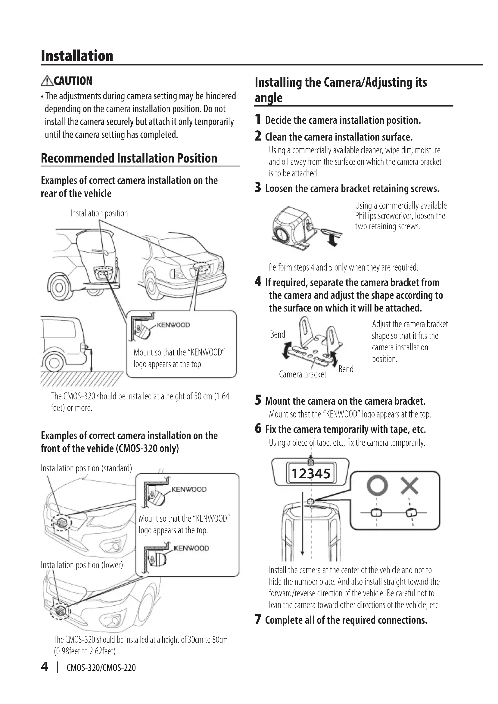 - Theadjustmentsduringcamerasettingmaybehindered dependingonthecamerainstallationposition.Donotinstallthecamerasecurelybutattachitonlytemporarilyuntilthecamerasettinghascompleted. Recommended Installation Position Examples of correct camera installation on the rear of the vehicleInstallation positionThe CMOS-320 should be installed at a height of 50 cm (1.64 feet) or more.Mount so that the “KENWOOD” logo appears at the top.Examples of correct camera installation on the front of the vehicle (CMOS-320 only)The CMOS-320 should be installed at a height of 30cm to 80cm (0.98feet to 2.62feet).Mount so that the “KENWOOD” logo appears at the top.Installation position (standard)Installation position (lower) Installing the Camera/Adjusting its angle 1 Decide the camera installation position. 2 Clean the camera installation surface. Using a commercially available cleaner, wipe dirt, moisture and oil away from the surface on which the camera bracket is to be attached. 3 Loosen the camera bracket retaining screws. Using a commercially available Phillips screwdriver, loosen the two retaining screws.Perform steps 4 and 5 only when they are required. 4 If required, separate the camera bracket from the camera and adjust the shape according to the surface on which it will be attached. Bend Bend Camera bracketAdjust the camera bracket shape so that it fits the camera installation position. 5 Mount the camera on the camera bracket. Mount so that the “KENWOOD” logo appears at the top. 6 Fix the camera temporarily with tape, etc. Using a piece of tape, etc., fix the camera temporarily. Install the camera at the center of the vehicle and not to hide the number plate. And also install straight toward the forward/reverse direction of the vehicle. Be careful not to lean the camera toward other directions of the vehicle, etc. 7 Complete all of the required connections. Installation LVT2720-001A.indb 4 14/02/14 15:10CMOS-320/CMOS-220